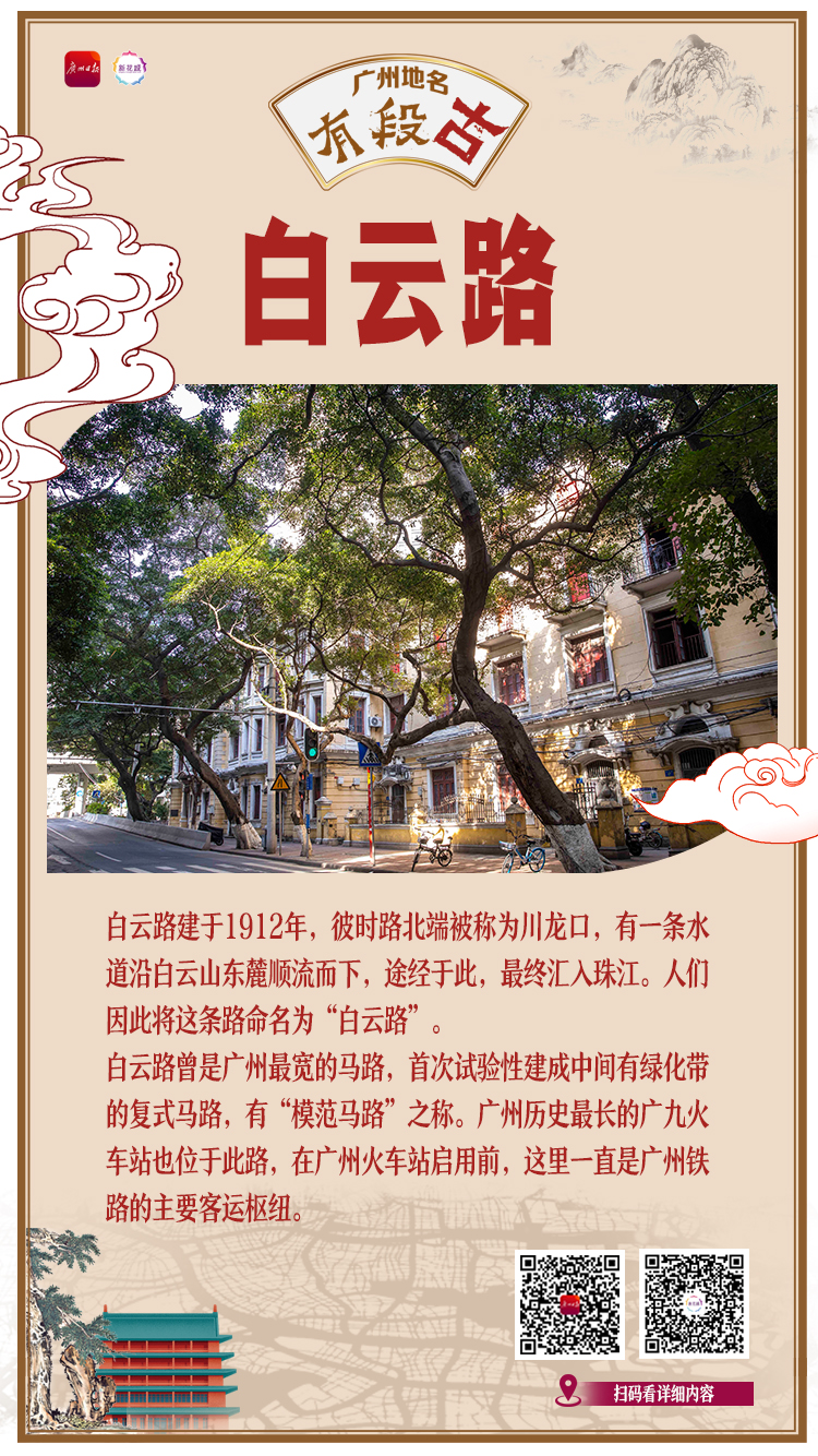 原来,白云路建于1912年,彼时,路北端被称为川龙口,有一条水道沿白云山东麓顺流而下,途经于此,最终汇入珠江。人们因此将这条路命名为“白云路”,通过地名,让大家记住这条水道的“根”——白云山。