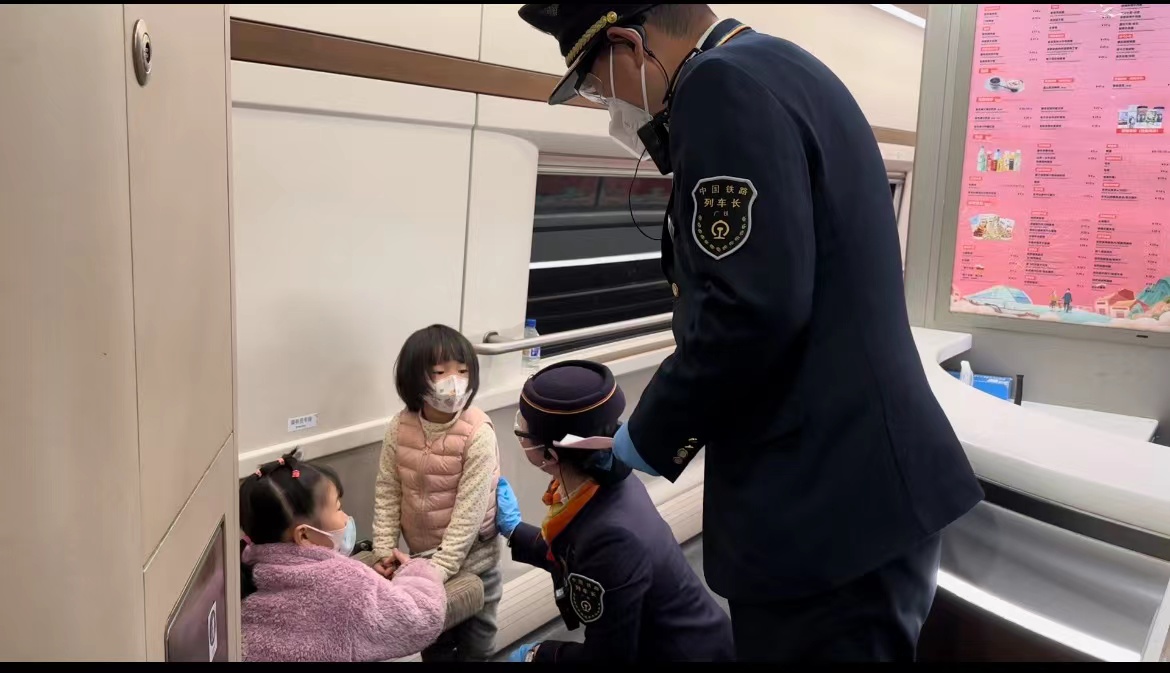 “G1011次列车长,4号车厢有2个小朋友的家长没赶上车。”16时14分,列车刚从长沙南站驶出,对讲机传来长沙南站客运员的呼喊,列车长赵丹心咯噔一下,立即通知列车员寻找小孩,自己也快步赶去。直到看到列车员牵着两个小女孩走过来,才舒了一口气。