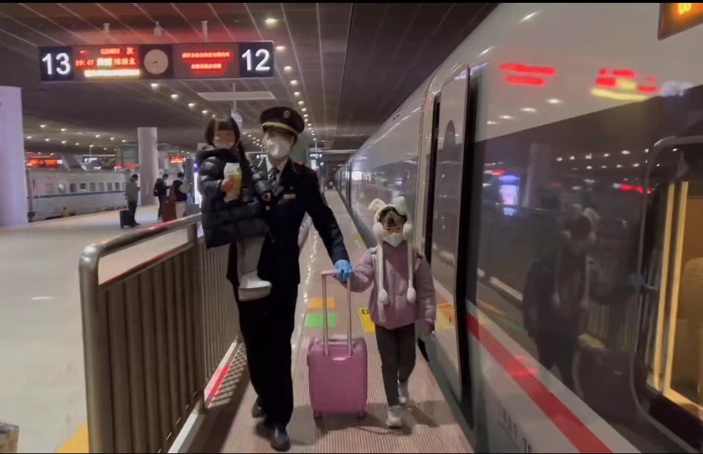 19时41分,列车到达深圳北站。列车长张伟一手抱着细细,一手牵着洋洋,将她们交给了深圳北站客运员。