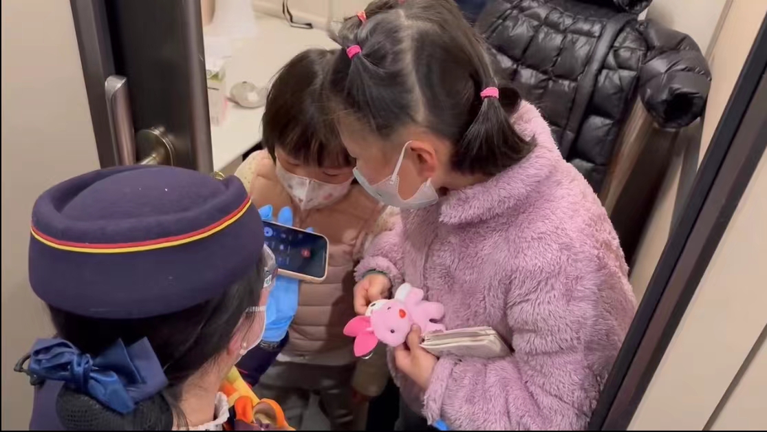 1月28日16时20分,4岁的细细和7岁的洋洋在G1011次列车乘务间内,拉着列车长赵丹的手,与父母通着电话。她们的父母,开车前因为下车寻找行李而误了车。