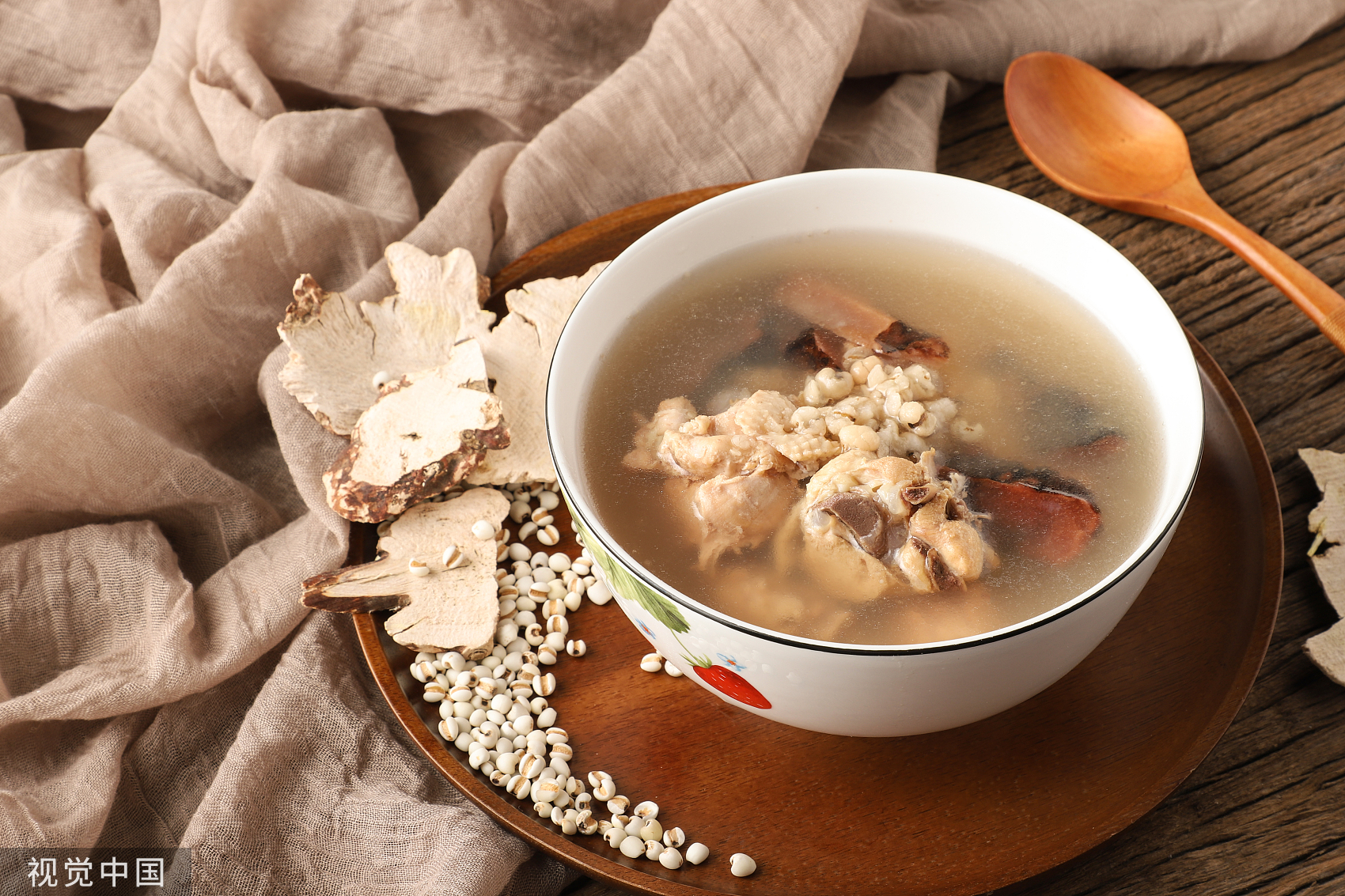 点评:茯苓、薏米化湿,山药为健脾之物,脾主消化,陈皮燥湿理气,一同煲汤有化湿消食健脾之功。
