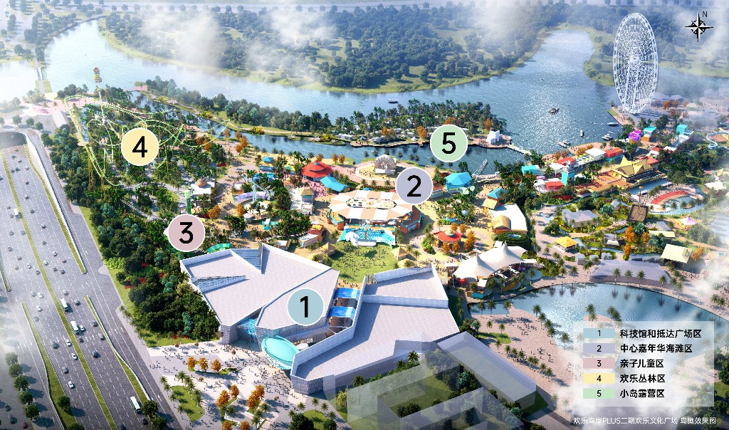 此外,二期项目配建具备公共休闲、科技体验、自然教育、娱乐互动等功能,引入如极限运动、现场音乐、美食集市、科普研学等潮流业态。除了中心嘉年华海滩区、欢乐丛林区、小岛露营区等特色区域,项目拟建设全国首个室内外结合的自然探索中心、引入国内顶流IP打造亲子儿童区、创新推出全国首台定制心形轨道电磁弹射过山车,为佛山再造多个地标游乐项目。