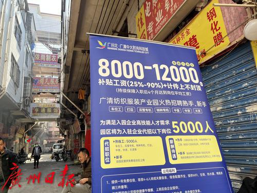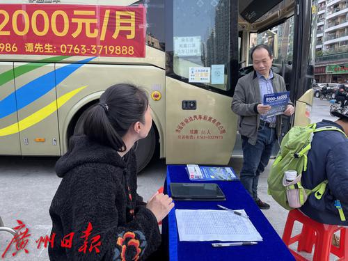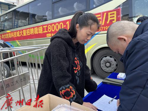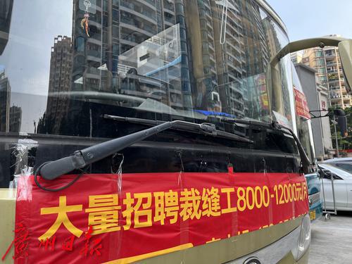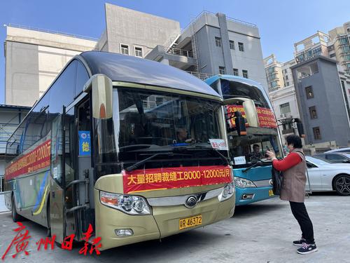 2月2日,广州康乐村附近,清远服装产业园开大巴来到广州招工,挂出“月薪8千-1.2万”的横幅,吸引了周边的制衣工人,每天都有不少工人坐大巴去服装产业园了解情况。