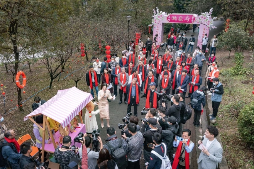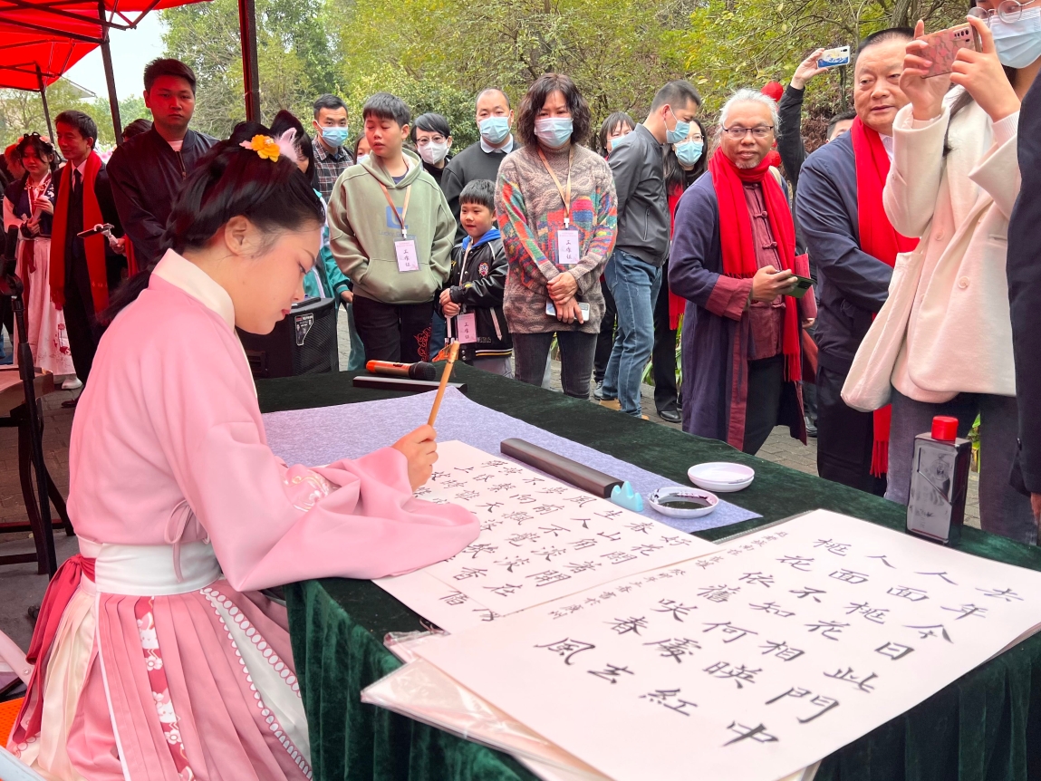 万物含新意,同欢圣日长!2月4日正是立春,广州市白云区政府在均禾街石马桃花公园举办“桃花雅集2023”暨“诗意白云”新春诗会,岭南书画名家们相聚在桃林水岸,吟诗诵词,泼墨挥毫。这场文化盛会不仅融合了诗词书画交流,还有彩灯、剪纸、广绣、广彩等非遗艺术体验,拉近大众与诗词文化的距离,展现了传统文化的传承之美。