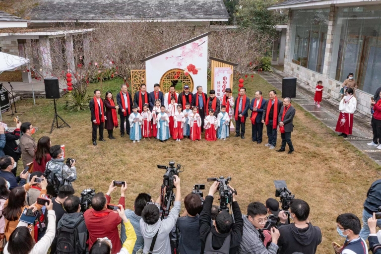 在湖畔草坪,中国作家协会主席团委员、中国诗歌学会会长杨克以诗会曲,与广东粤剧青年花旦何静韵,共同演绎创编诗曲对唱《春华满园》,诗词秀美,曲韵绵绵,唱出春日百花齐放之美,人们富足安居之乐。十几名传着传统汉服的孩童手捧诗书,齐声诵读经典古诗词,朗朗童声,为春意盎然的桃园更增添几分生机。