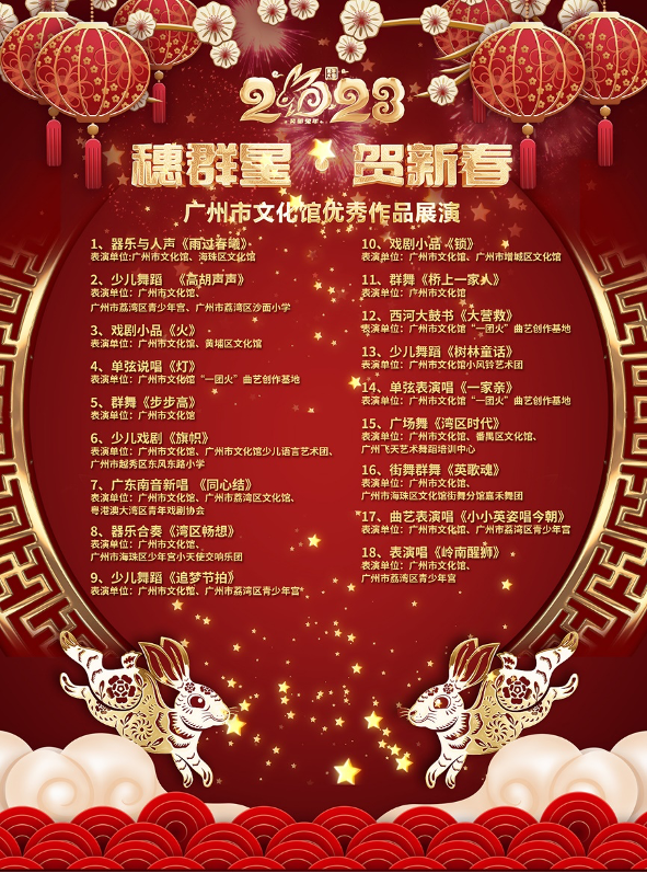 舞蹈逐梦青春、歌曲演绎粤韵、戏剧抒发真情,一件件优秀群文作品线上展示,看点十足……2月5日下午3时,由广州市文化馆主办的2023“穗群星·贺新春”广州市文化馆优秀作品展演在央视频播出,为广大群众献上一场独具岭南韵味的文化盛宴,与全国百姓一同喜庆祥和闹元宵。