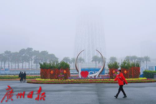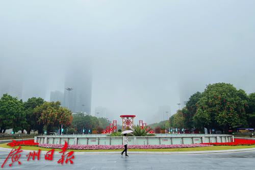 2023年2月6日,一位游客走过花城广场,广场周围的高楼大厦几乎隐没在大雾中。