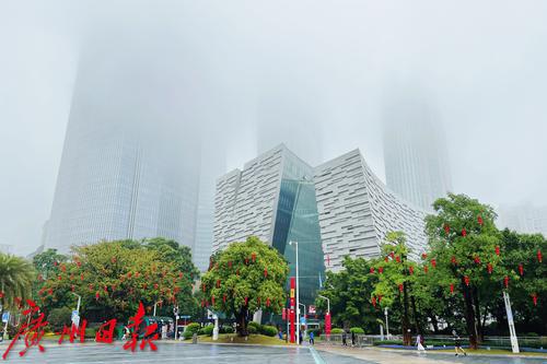 2023年2月6日,广州花城广场,广州图书馆周边的高楼被雾气笼罩。