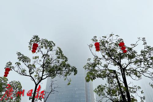 2023年2月6日,广州花城广场,东塔在大雾中若隐若现。