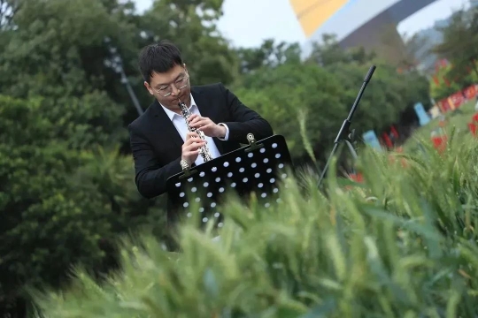 舞台搭在麦田里,音乐声回荡在麦浪里。福田交响乐团,上演木管五重奏。律动的音乐、沉醉的人群,谱写了市民农田里的动人旋律。