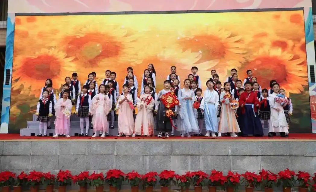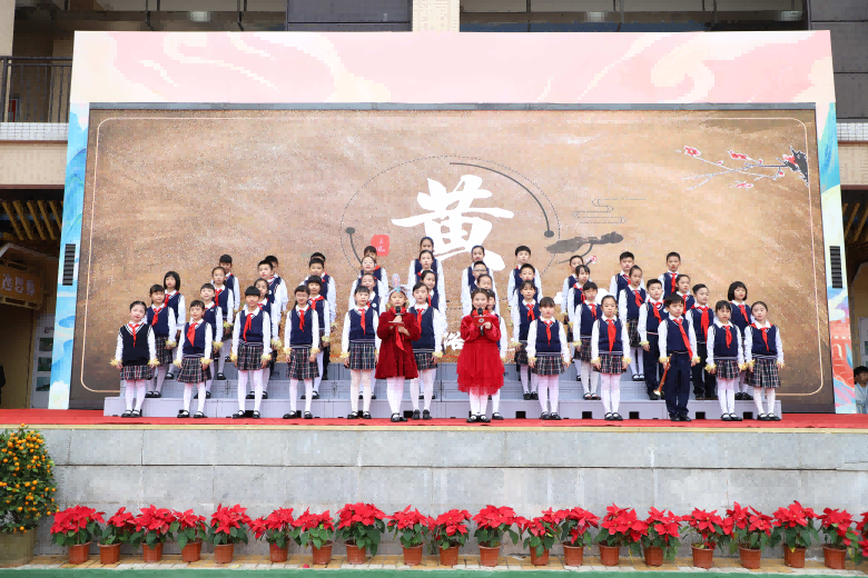 开学典礼主题是“赤黄白青黑,五彩斑斓耀我家”,以央视春晚创意节目《满庭芳·国色》为引,以中华五色赤、白、黄、青、黑为主线,讲述了色彩中蕴藏的中国人的审美情趣和文化积淀,希望借此将国色、家文化、家国情怀根植于学生心灵深处,引导孩子们赓续中华文脉、坚定文化自信。