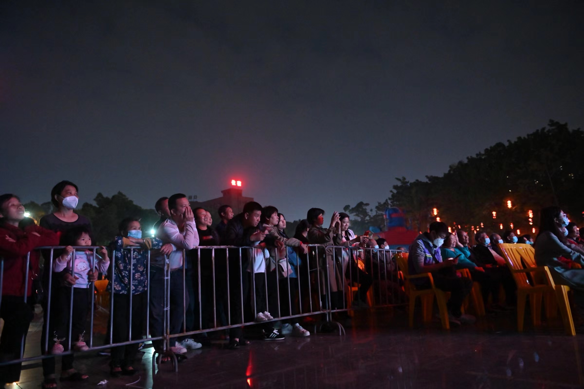 有些观众比较随意,就趴着文化广场观众席外围的“铁马”围栏处观看,这样一看,也站了两个多小时。小林和他的朋友本来在看广场附近举行的一场篮球赛,听到这边有唱戏的声音就过来了,“我们是外地来打工的。今天是第一次看粤剧,舞台很美,演员年轻靓丽,唱得也很好听。觉得挺有意思的。”