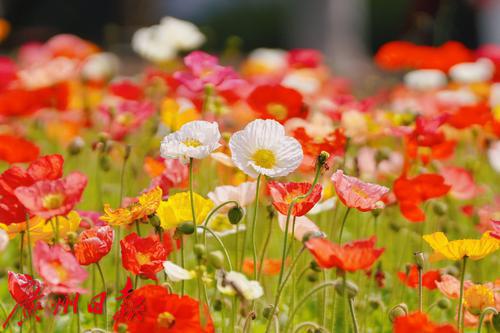 2023年2月9日,各种鲜艳颜色的虞美人花朵在风中摇摆。