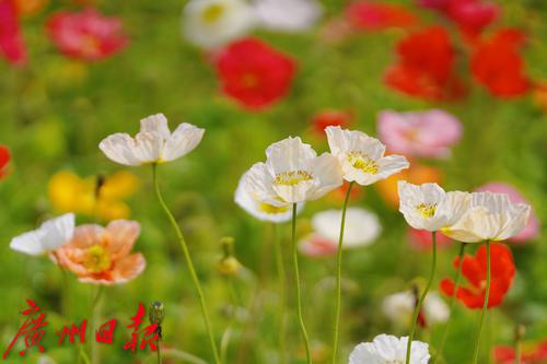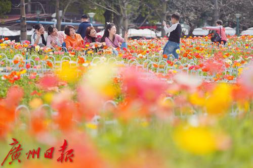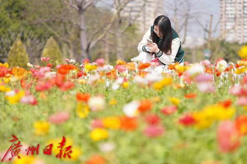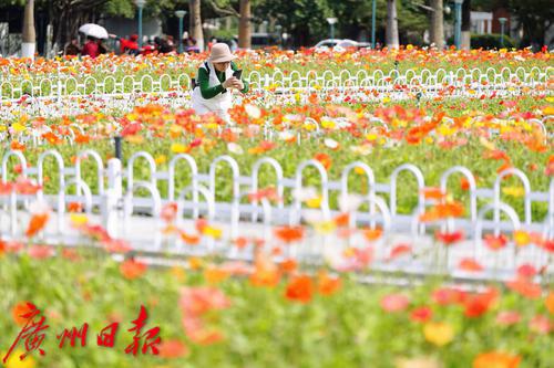 2023年2月9日上午,广州二沙岛宏城公园,大片虞美人花海进入盛花期,吸引不少市民前来打卡拍照。当天上午广州偶有阳光,还有蓝天出来探探头。预计下周初(13-14日)会有明显的冷空气南下,到时会有蓝天、阳光,喜欢拍花的朋友抓紧时间来宏城公园打卡,周末估计人会超多。