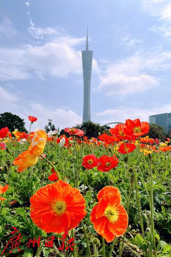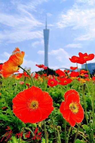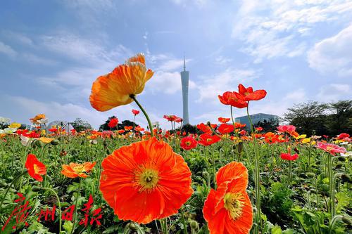 2023年2月9日,虞美人在广州塔下娇艳绽放。