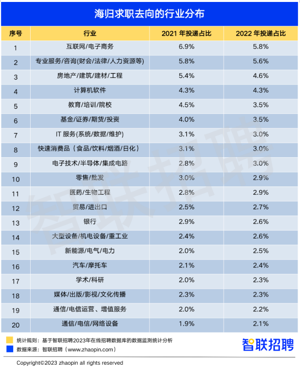 2月9日,招聘平台(智联招聘)发布《2022中国海归就业调查报告》,结合平台大数据及问卷调研,重点关注2022年海归群体的就业形势。数据显示,2020年以来,在国内求职的海归数量明显增长。与2021年相比,2022年应届留学生规模同比增长8.6%,回国求职留学生数量再创新高。从企业招聘的角度来看,专业服务、生物医药、装备制造行业对海归招聘需求进一步扩大。