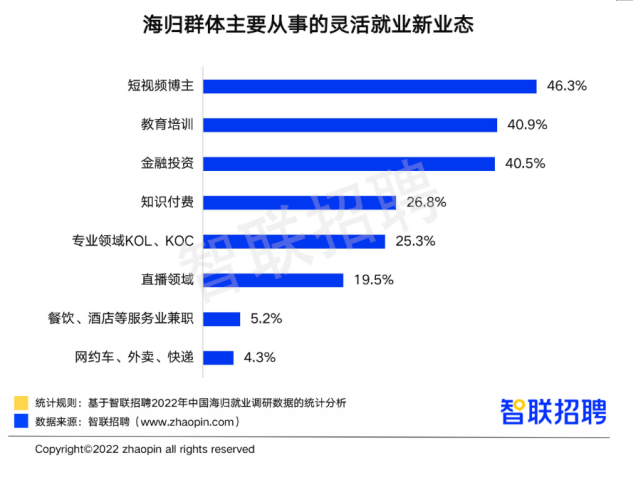 此外,海归也对“灵活就业”这种新兴工作方式有所尝试。55.5%的海归表示愿意尝试灵活就业,其中32.9%表示“已经有很多人在尝试”,22.6%认为“近两年明显升温”。从灵活就业的业态来看,46.3%的海归表示在尝试短视频博主,排名第一。其次是教育培训、金融投资和知识付费,分别占比40.9%、40.5%和26.8%。