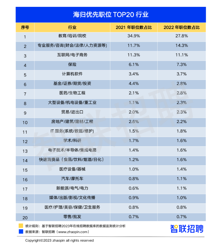 数据显示,2023年春节后第一周,海归优先的职位数和在国内求职的海归人数均呈上扬态势,2月3日的海归优先职位数比1月28日增长11%,海归求职人数增长27%。从2022年海归优先岗位的行业分布来看,教育/培训行业的职位数占比27.8%,依然位居第一位,专业服务/咨询、互联网/电子商务分别位居第二、第三。