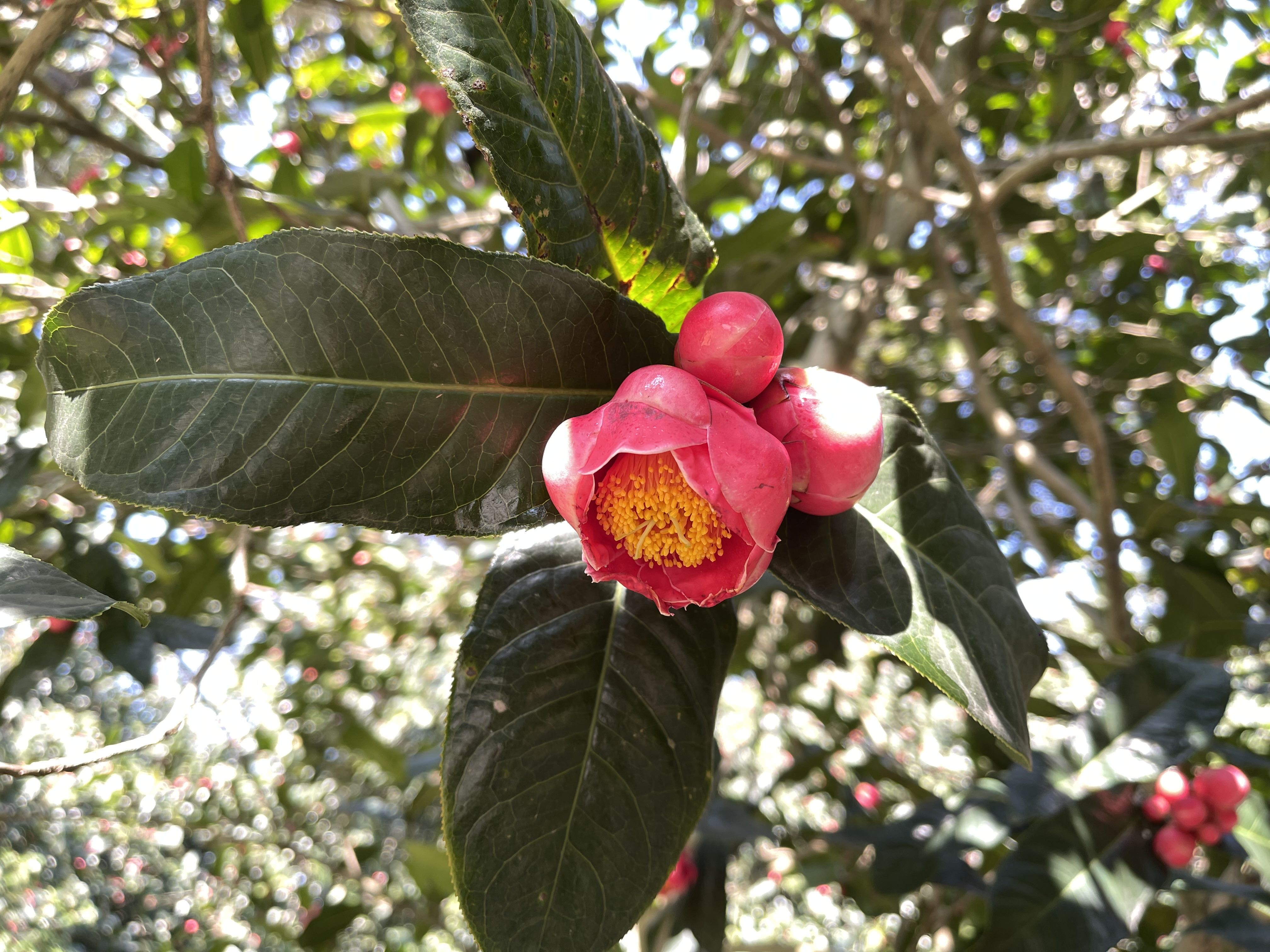 说到“远道而来”品种,还有“越南抱茎茶”。因为它的叶片大,基部抱茎,所以有了这样形象的名字。越南抱茎茶从9月开始就蠢蠢欲动,显现出手指头般大的花蕾,犹如一颗颗红色玛瑙镶能在绿莹莹的翡翠上,远远看去以为是果,实则不然。次年入春后其红艳的花瓣方逐渐开放,绽放出金黄色的花蕊,据闻花期可一直延续到6月,精彩不容错失。