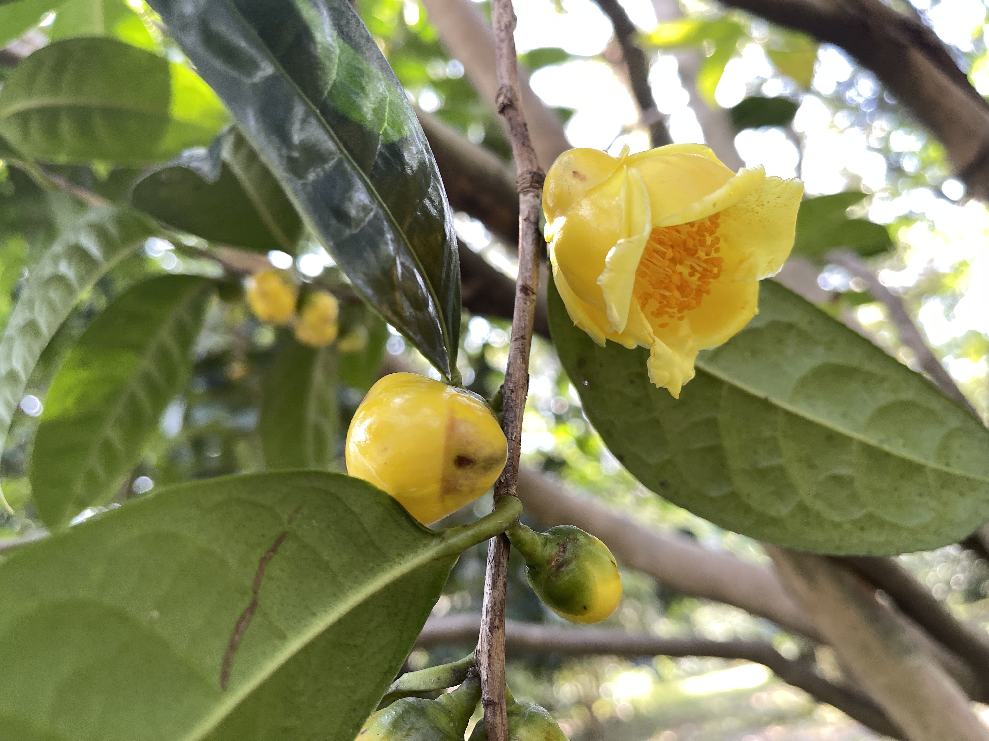 若“以颜色论英雄”,山茶园里最引人注目的品种,非“植物界的大熊猫——金花茶”莫属。花色金黄,耀眼夺目,仿佛涂着一层蜡,晶莹油润,似有半透明之感,尊称它为“茶族皇后”大概一点也不过分。记者端详后发现,这种金花茶的花型很特别,刚盛开的花朵似杯状、壶状,再盛开一点便又似碗状,似乎总是含苞待放的样子,秀丽而雅致。跨越寒冬和暖春,每年1月至4月,金茶花都会迎来盛花期。