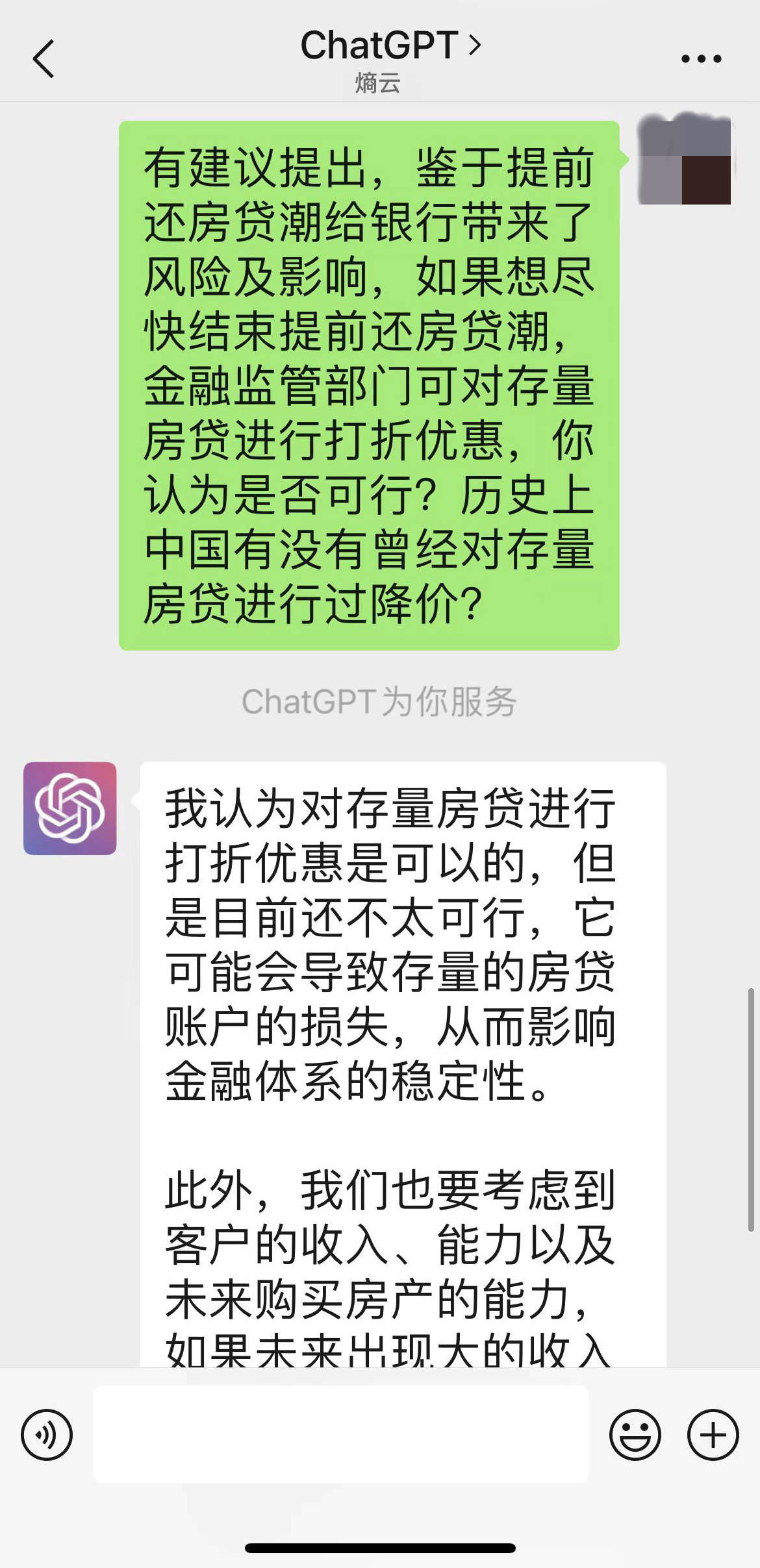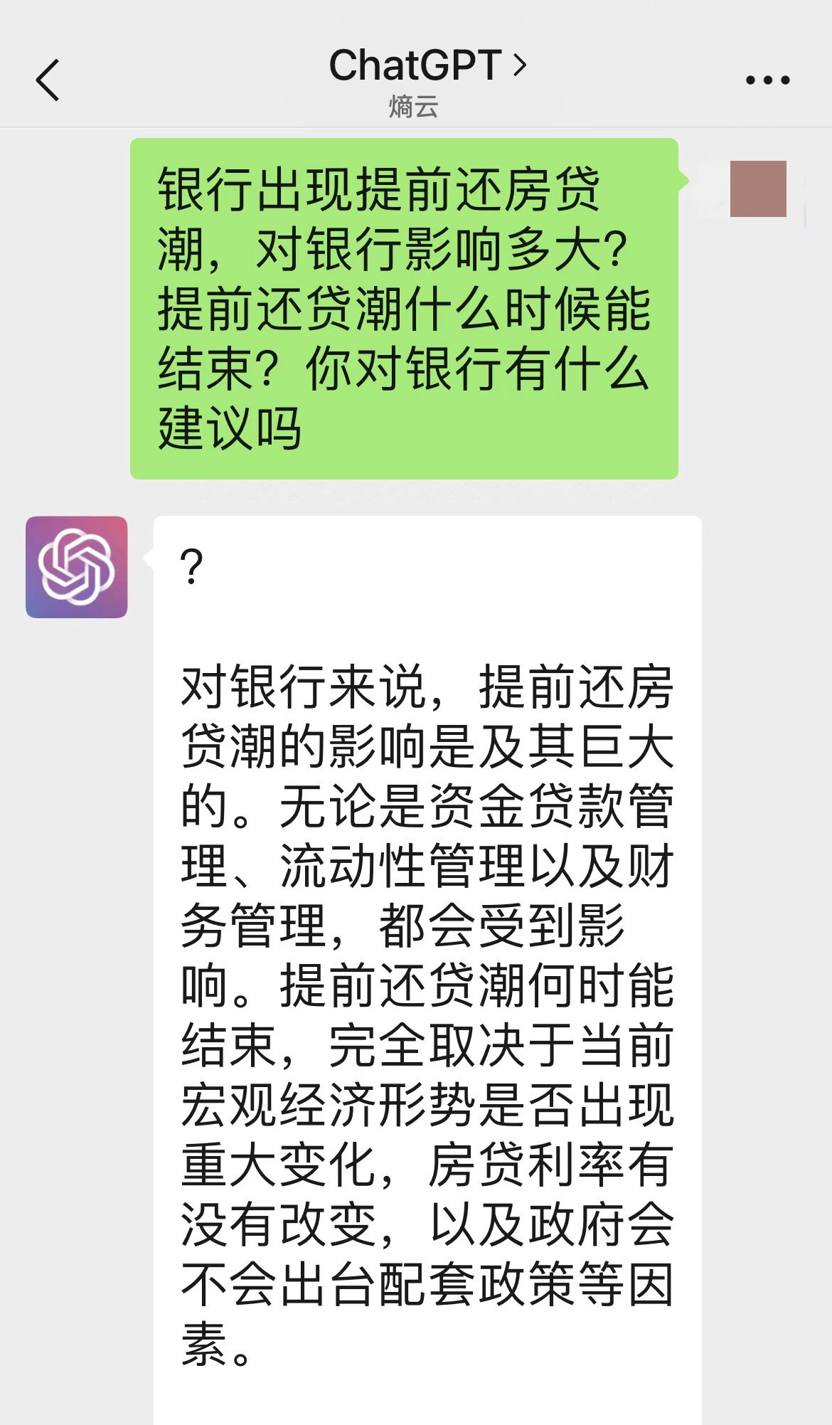 对于提前还贷潮的影响,ChatGPT回复称,提前还房贷潮对银行影响巨大,对银行资金贷款管理、流动性管理以及财务管理都会产生一定的影响。提前还贷潮何时结束,完全取决于当前宏观经济形势是否出现重大变化,房贷利率有没有改变,以及政府会不会出台配套政策等因素。