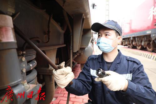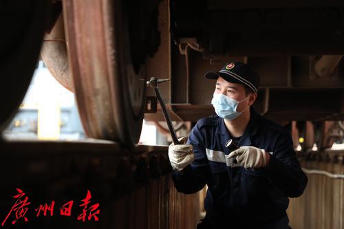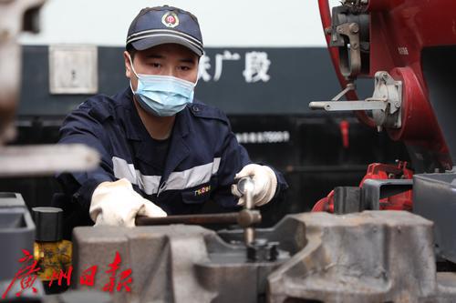 近日,南方阴雨连绵,有些闷热。在广州机务段露天整备场上,铁路工人们正紧张有序地检修着火车头。“东风4型机车2232进12道,后面还有车入库,请谌锋抓紧看车。”2月7日13时,对讲机里传来工长董永吉的声音。收到指令后,机车钳工、青年突击队员谌锋赶忙放下刚吃了几口的盒饭,拿起工具,顶着微微细雨,向12道快步走去。春运以来,广州机务段平均每天完成80台机车的检修整备工作,确保了京广、京九、赣深等20余条线路客货列车运行的安全稳定。