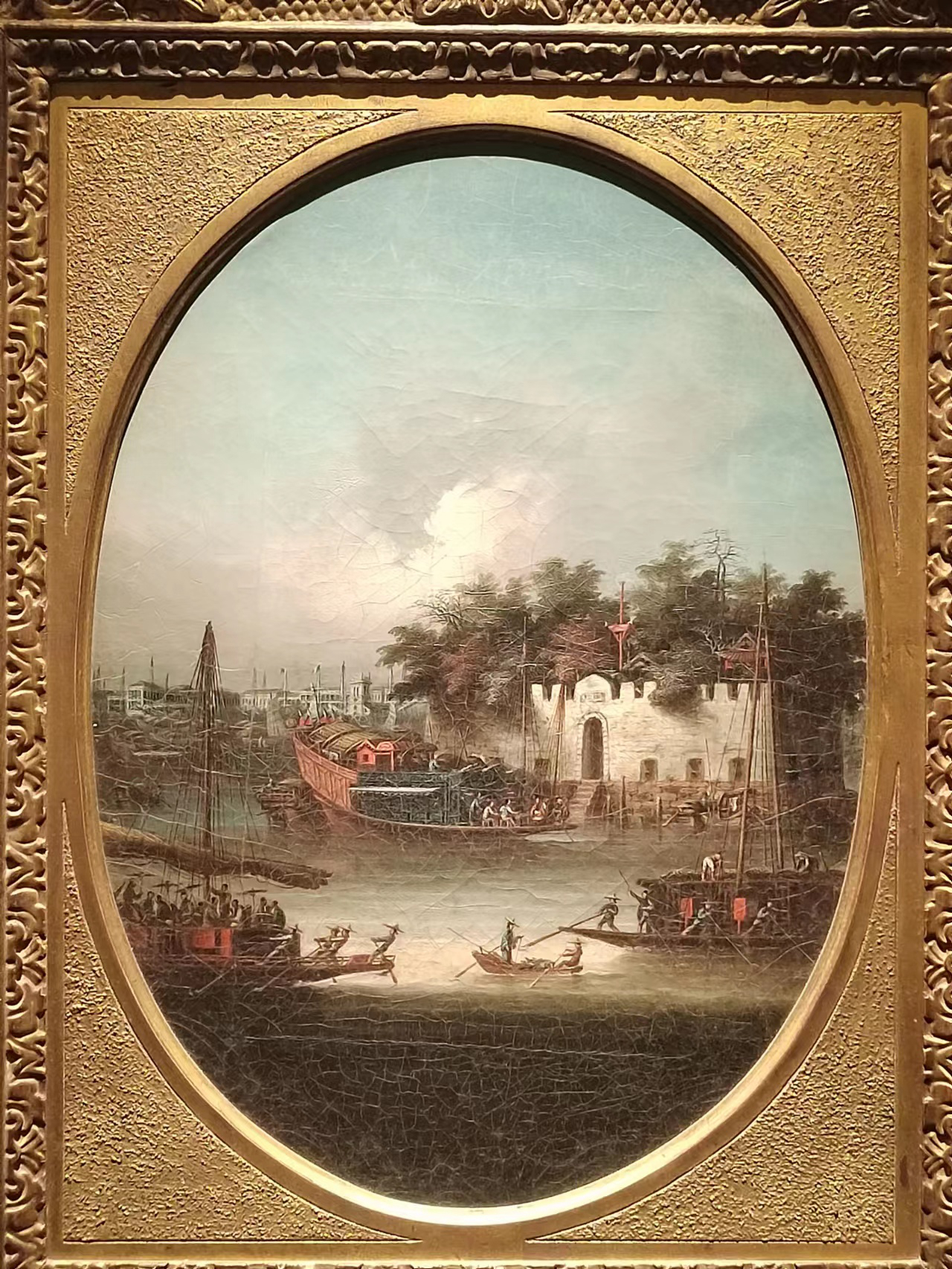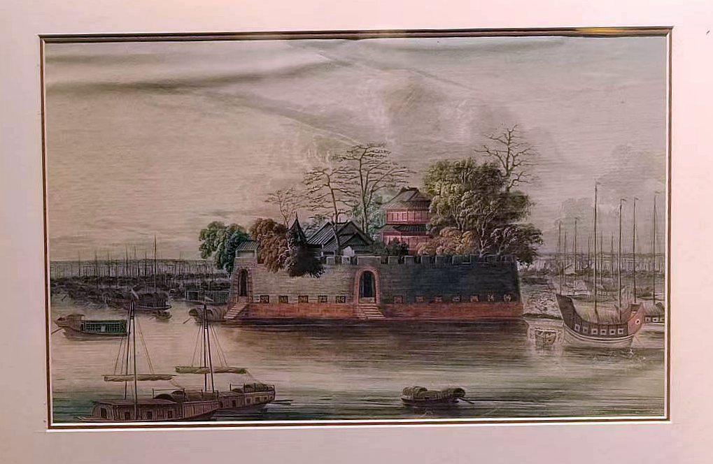 这件正在广东省博物馆“焦点——18-19世纪中西方视觉艺术的调适”展里展出的作品,是当时诸多以海珠炮台为描绘对象的画作之一。在许多这类画作中,海珠炮台在江水和天空的映衬之中,气势壮观,又带有一种南国独有的葱郁而潮湿的气息。