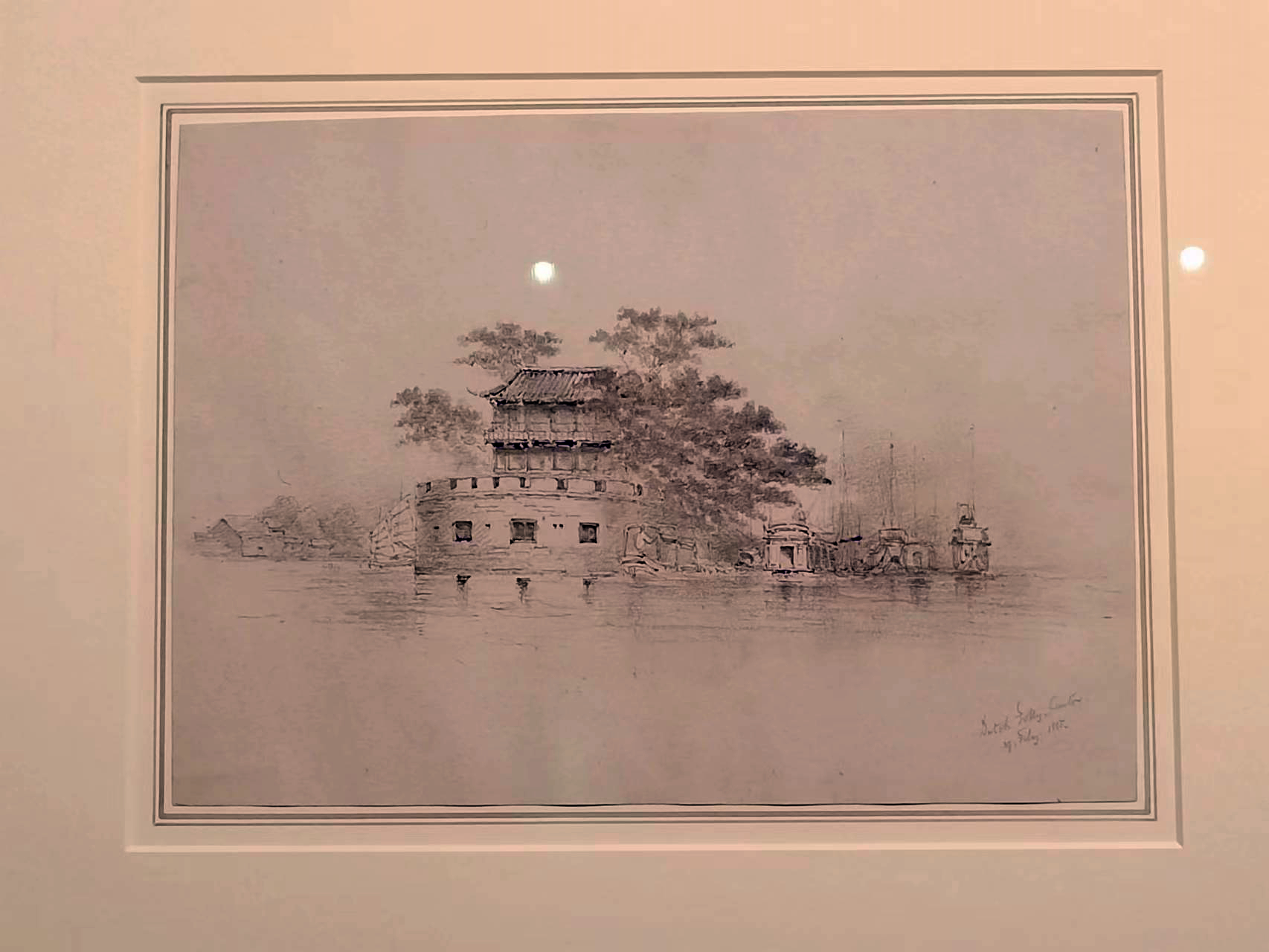 1855年2月19日,苏格兰医生兼业余画家托马斯·屈臣,也就是大家熟知的“屈臣氏”个人护理店创始人之一,在广州画了一张素描画《海珠炮台》。他用素淡的笔调精细描画了江心中海珠炮台的台楼、台体、炮孔、树木,以及台侧的几艘江船,而周边的其他景物,则近乎全部略去。画面给人以苍茫的美感。