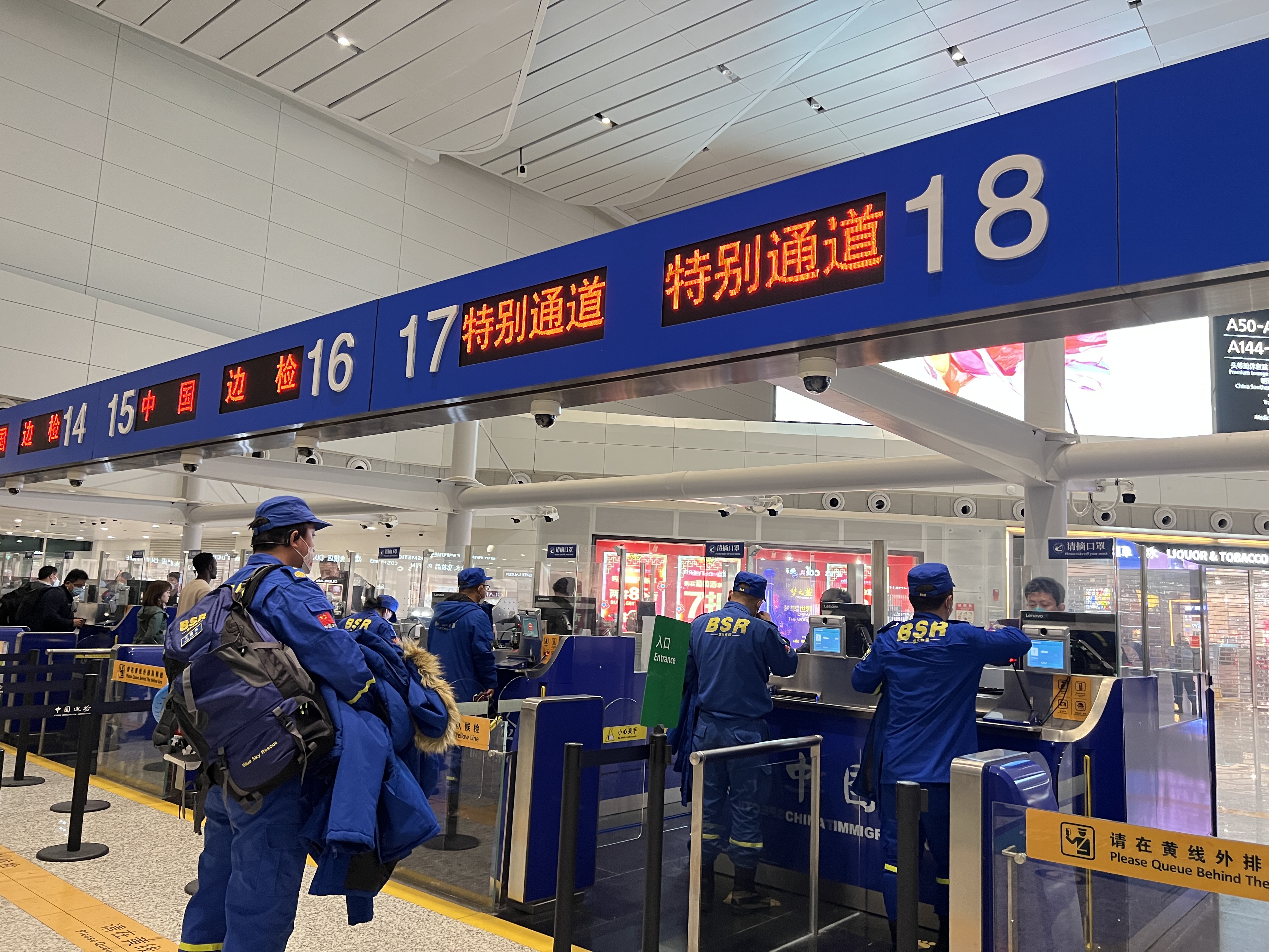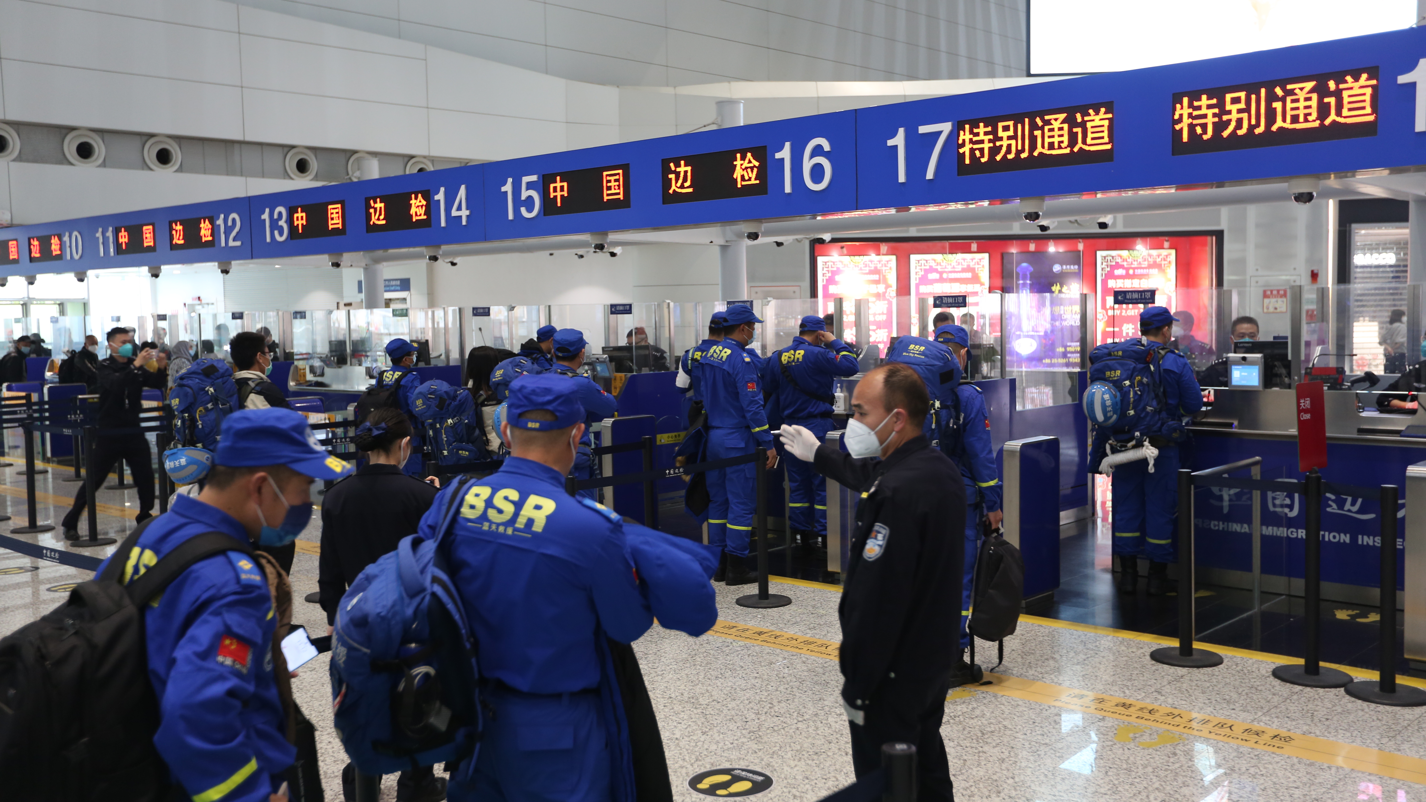 “为做好救援队伍通关边检勤务保障工作,我们提前掌握救援队通关信息,成立专项任务保障小组,提前对接,主动靠前服务。”白云边检站相关负责人介绍,白云边检在口岸进一步优化了警力配置和勤务组织,在T2航站楼边检执勤现场的出境方向,实行分区验放,强化动线管理,安排专人协助引导,开通绿色通道,提高查验效率,全力保障救援队伍高效便捷通关。
