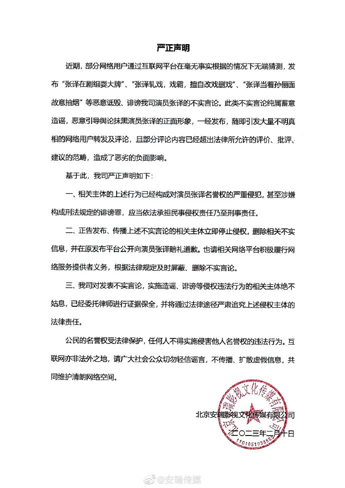 10日,演员张译的经纪公司北京安瑞影视文化传媒有限公司通过微博发布严正声明称,近期,部分网络用户通过互联网平台在毫无事实根据的情况下无端猜测,发布“张译在剧组耍大牌”“张译轧戏,戏霸,擅自改戏删戏”“张译当着孙俪面故意抽烟”等恶意诋毁、诽谤该公司演员张译的不实言论。
