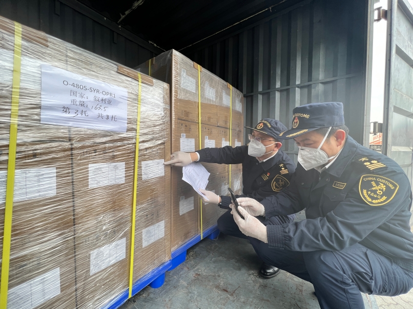 广州海关所属南沙海关关员在对出口叙利亚的救灾物资进行监管