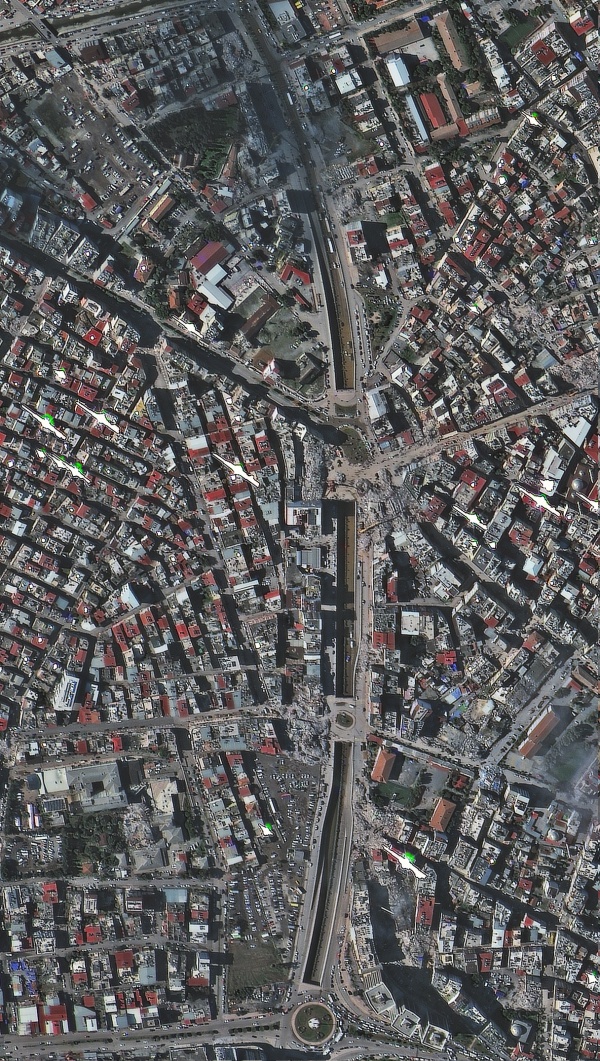 合成孔径雷达卫星对于金属极为敏感,图像中显示的白色亮点多为建筑中的金属结构,竖列的白色亮点表示高层建筑的主体机构相对完好,而零散的亮点可能为楼房倒塌后散落地面的金属。卫星图像分析技术团队结合震前当地的卫星影像后评估,卡赫拉曼马拉什市有众多连排高层建筑,地震后当地高层建筑损毁严重,这无疑加大了震后救援的难度。