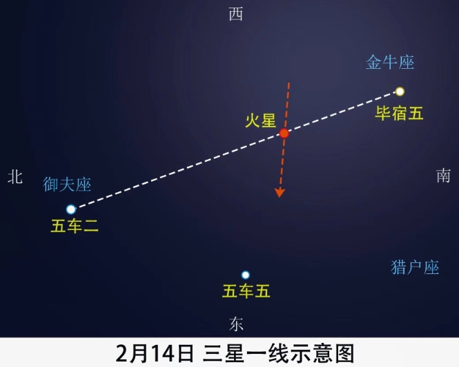 【14日“三星一线”奇趣天象将出现,在广州可以这样观测】2月14日晚上,浩茫苍穹将出现由恒星和行星联手排列的“三星一线”奇趣天象,御夫座最明亮的恒星“五车二”、距离地球最近的外行星火星和金牛座最明亮的恒星“毕宿五”,三星由北至南依次排成一条直线,十分惹人注目。各地可连续观看三天(2月13日至15日)。详情>>>