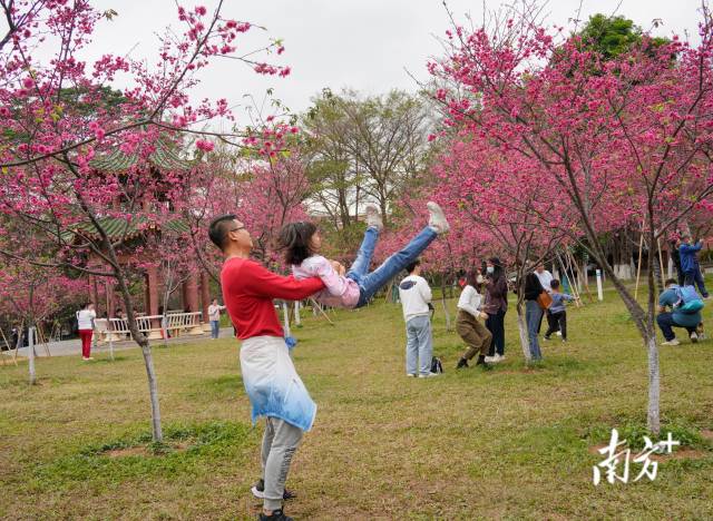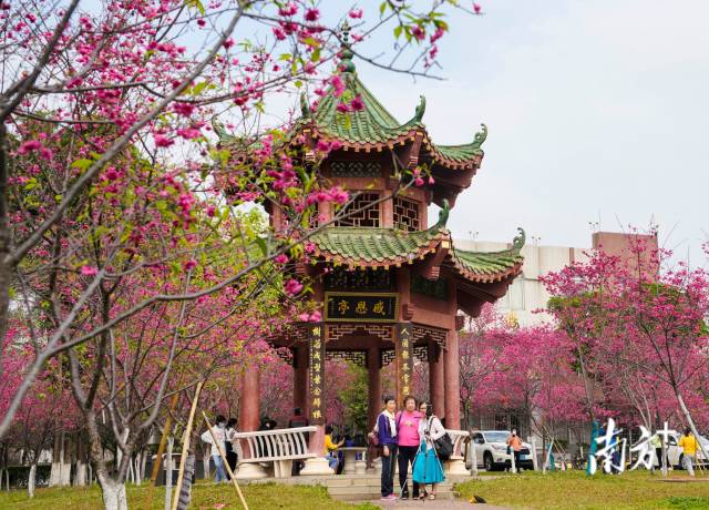 2月11日,立春过后,广州华南农业大学校园内已是春意盎然,鸟语花香。在花枝路旁种植的八重樱、寒绯樱、广州樱等樱花已悄然绽放。经过多日雨雾的洗礼,今天迎来短暂的晴天,粉红色的樱花与古建凉亭相互映衬,在阳光的照耀下显得格外迷人,吸引不少同学和市民前来赏花打卡。