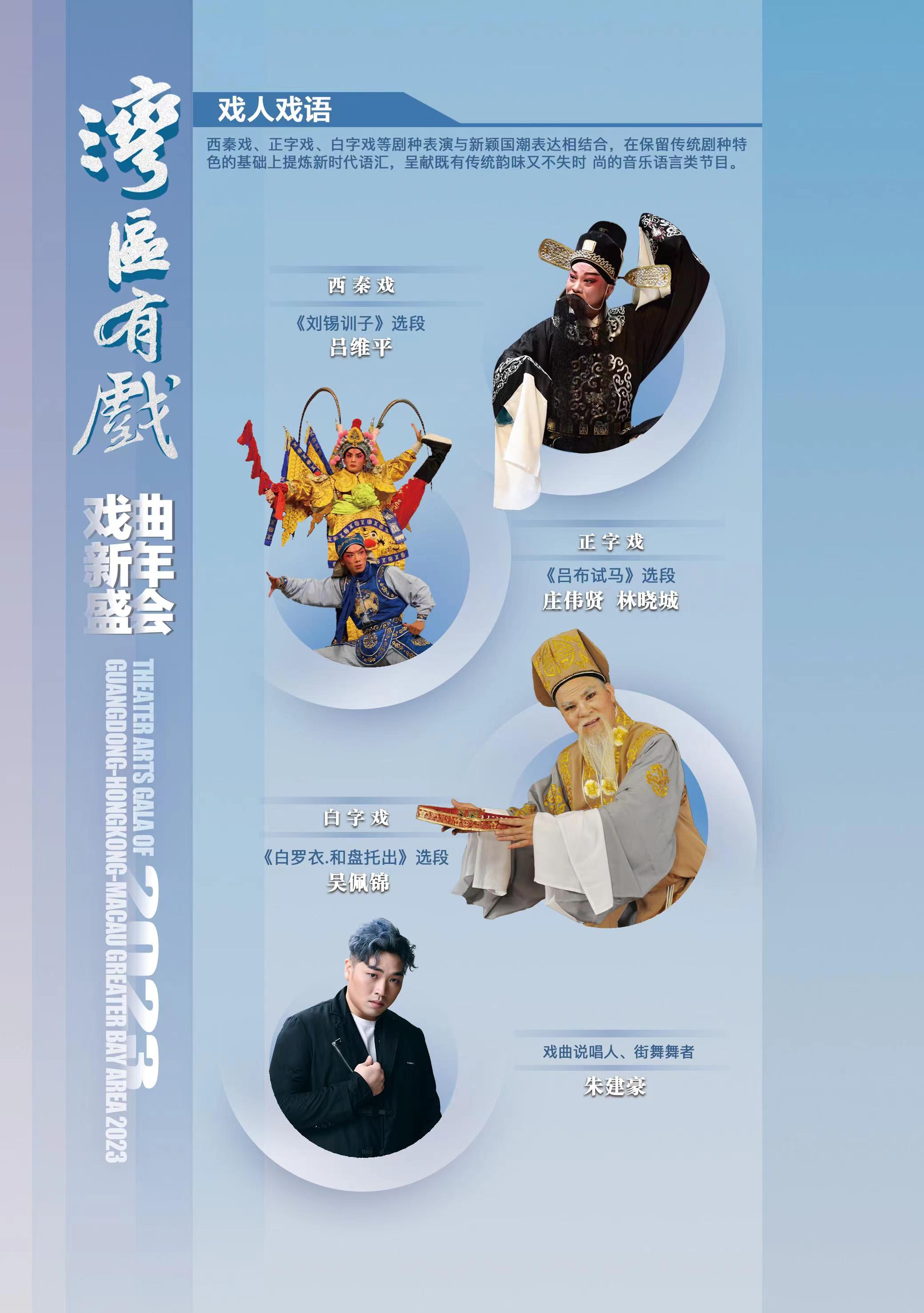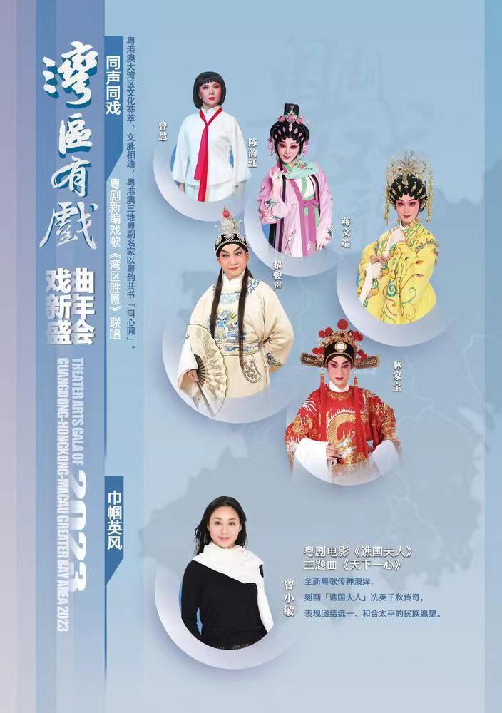 “湾区有戏”篇章则是戏歌联唱。黎骏声、陈韵红、蒋文端、林家宝、曾慧等粤港澳三地粤剧名家将同台献唱粤剧新编戏歌《湾区胜景》,以粤韵共书“同心圆”;粤剧名家曾小敏以全新粤歌《天下一心》,刻画“谯国夫人”冼英千秋传奇,表现团结统一、和合太平的民族愿望。