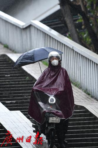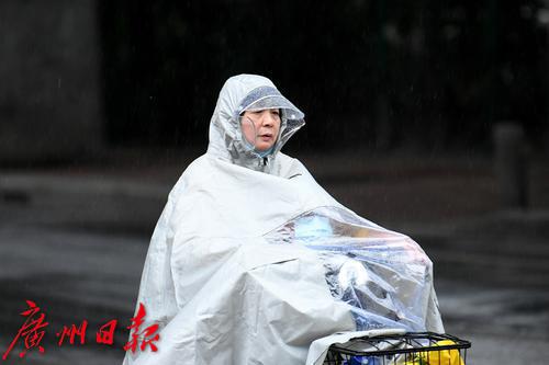 图为大雨拍打面部,一名骑行的市民不得不抽出手来调整一下雨衣。