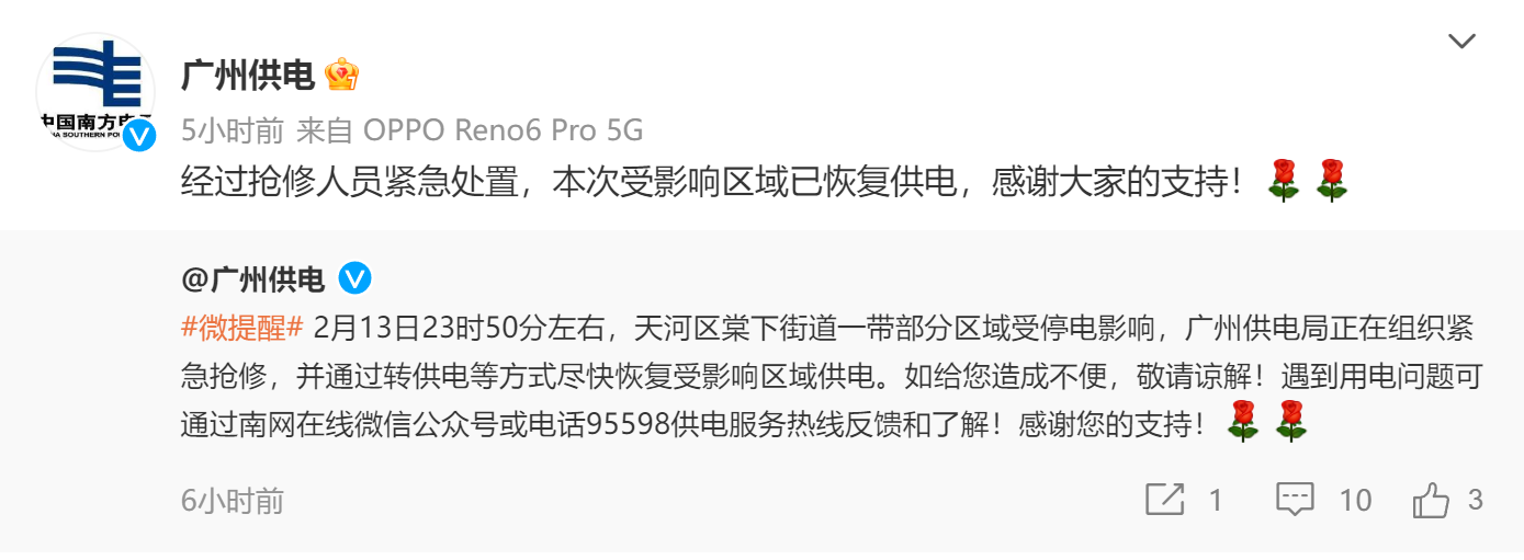 一小时后,广州供电局官方微博再次回应:经过抢修人员紧急处置,本次受影响区域已恢复供电,感谢大家的支持。