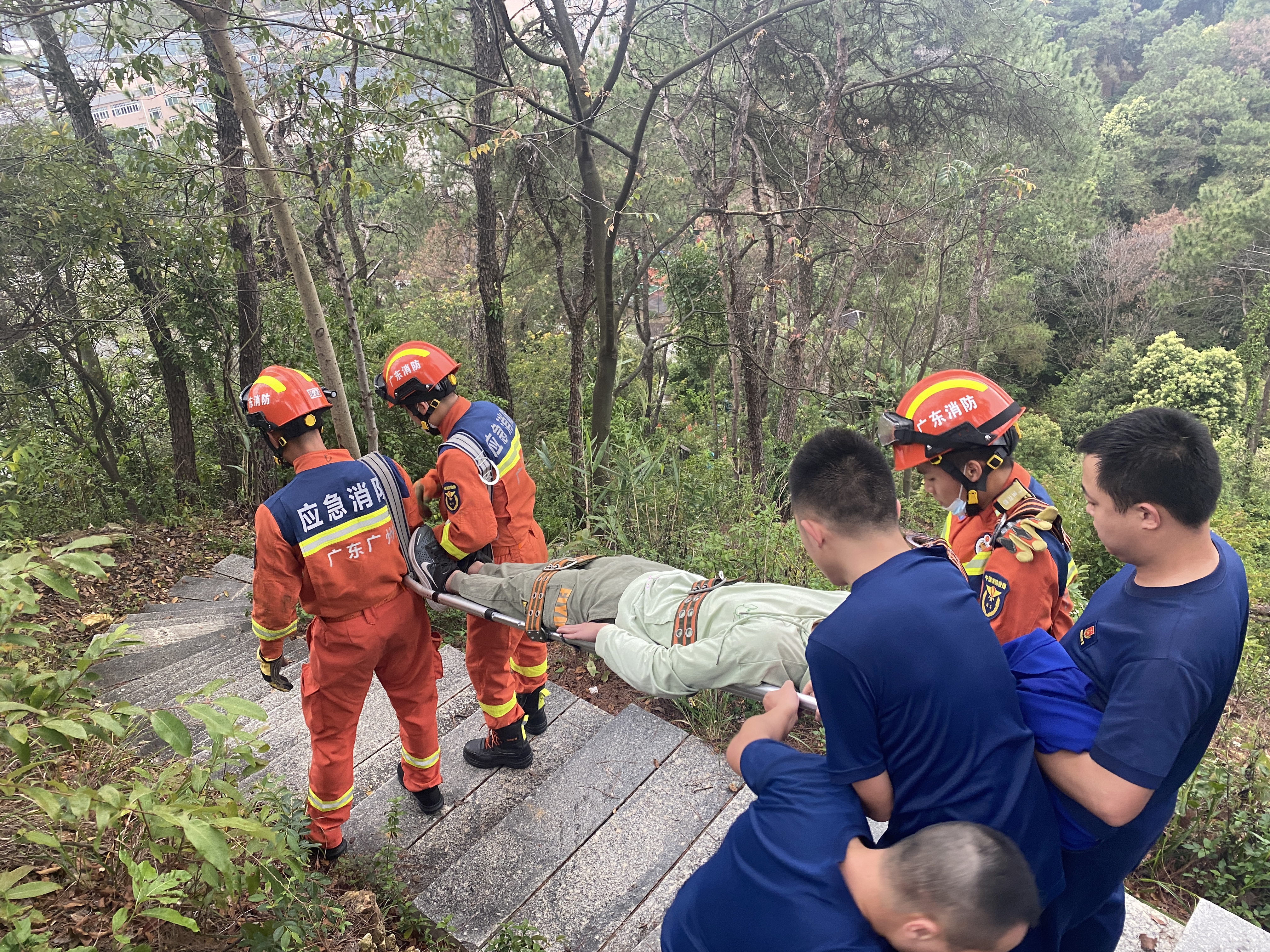 到达天狮公园山脚后,消防救援人员发现事发地点道路狭小、车辆无法通行,便携带多功能担架、绳索等相关救援器材,徒步2公里至事发地点。20分钟后,消防救援人员找到了受伤男子,并了解到其脚部受伤,现场医护人员已经利用绷带对受伤部位进行了简单的包扎、固定处理。