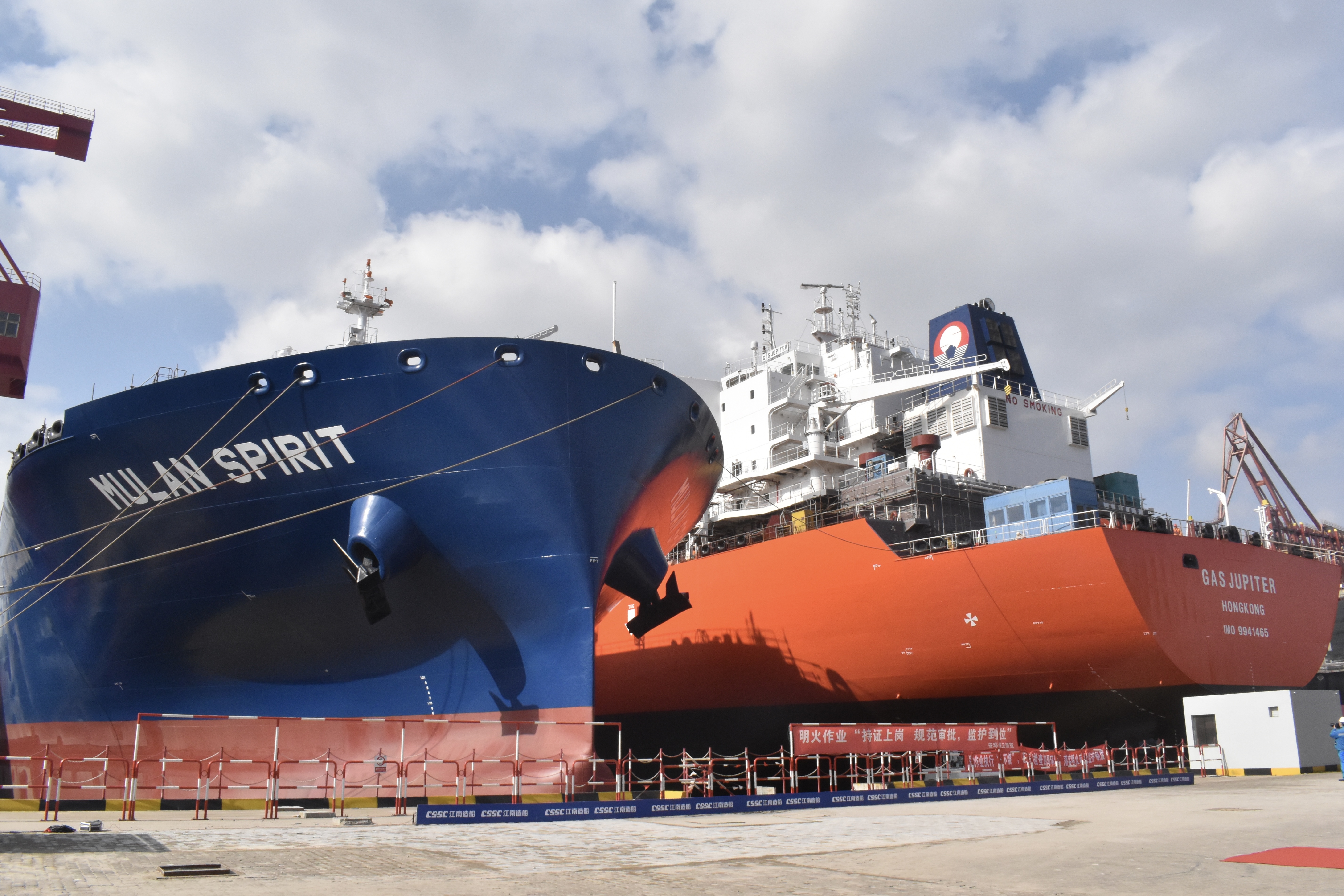 当天,江南造船为广东九丰能源集团有限公司建造的国内首制79800立方米Mark III型薄膜式液化天然气(LNG)运输船,以及为天津西南海运有限公司建造的93000立方米超大型液化气船(VLGC)首制船率先在4号坞出坞。