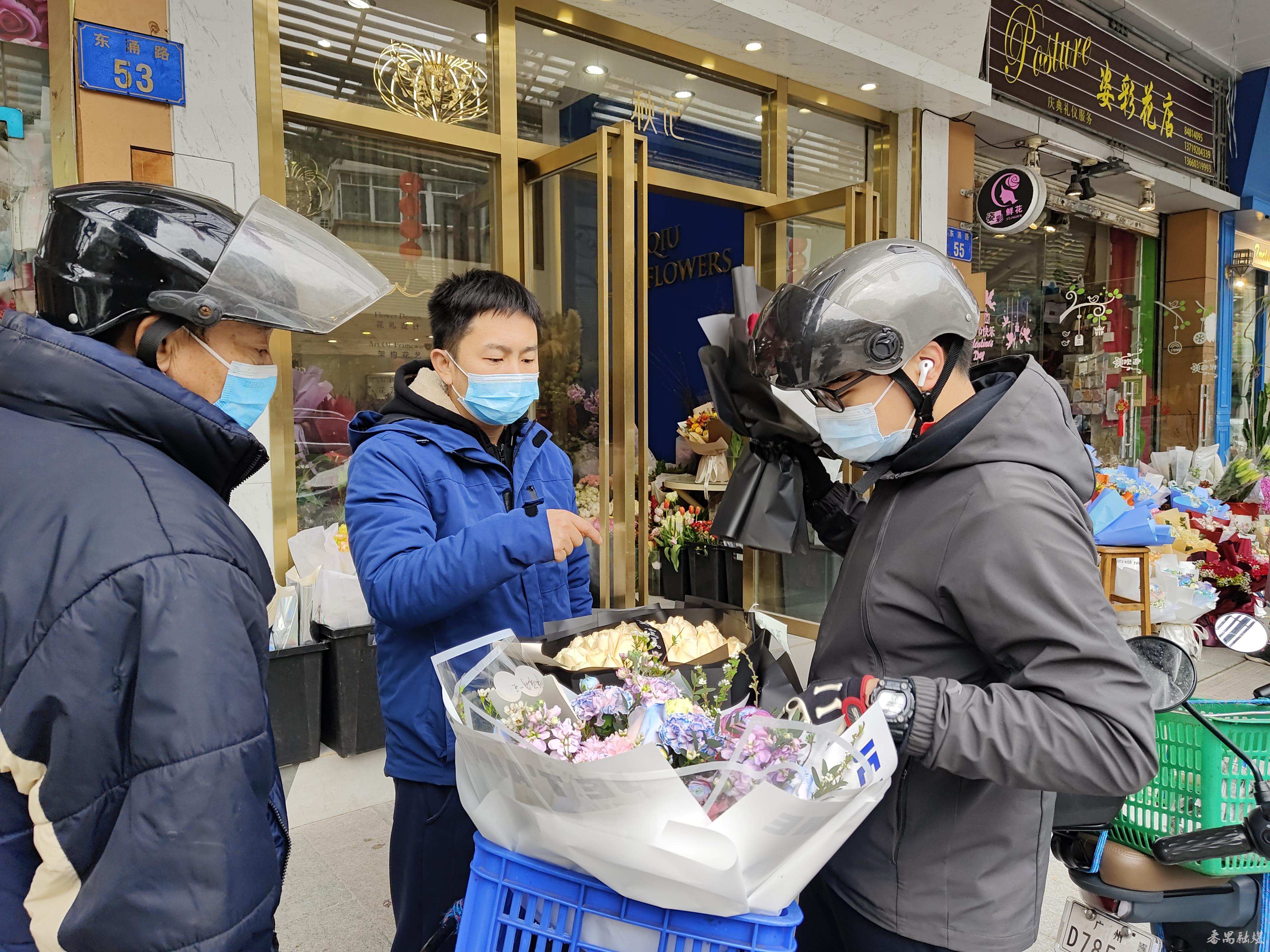 记者在现场发现,除了花店工作人员忙个不停,前来接单送货的外卖小哥亦络绎不绝。“这些包装好的花束都预定好的了,除了部分客户会上门来取,大部分都是通过外卖小哥送出。”花店老板林小姐告诉记者,顾客只要选好花型、数量等,在约定的时间,花店就会将包装精美的玫瑰花送货上门。“我们平时都是送餐、送快递,今天下单的大多都是鲜花订单。”外卖小哥李师傅表示,这几天接到鲜花订单很多,他们都当起了“送花使者”,把甜蜜送到市民手中。