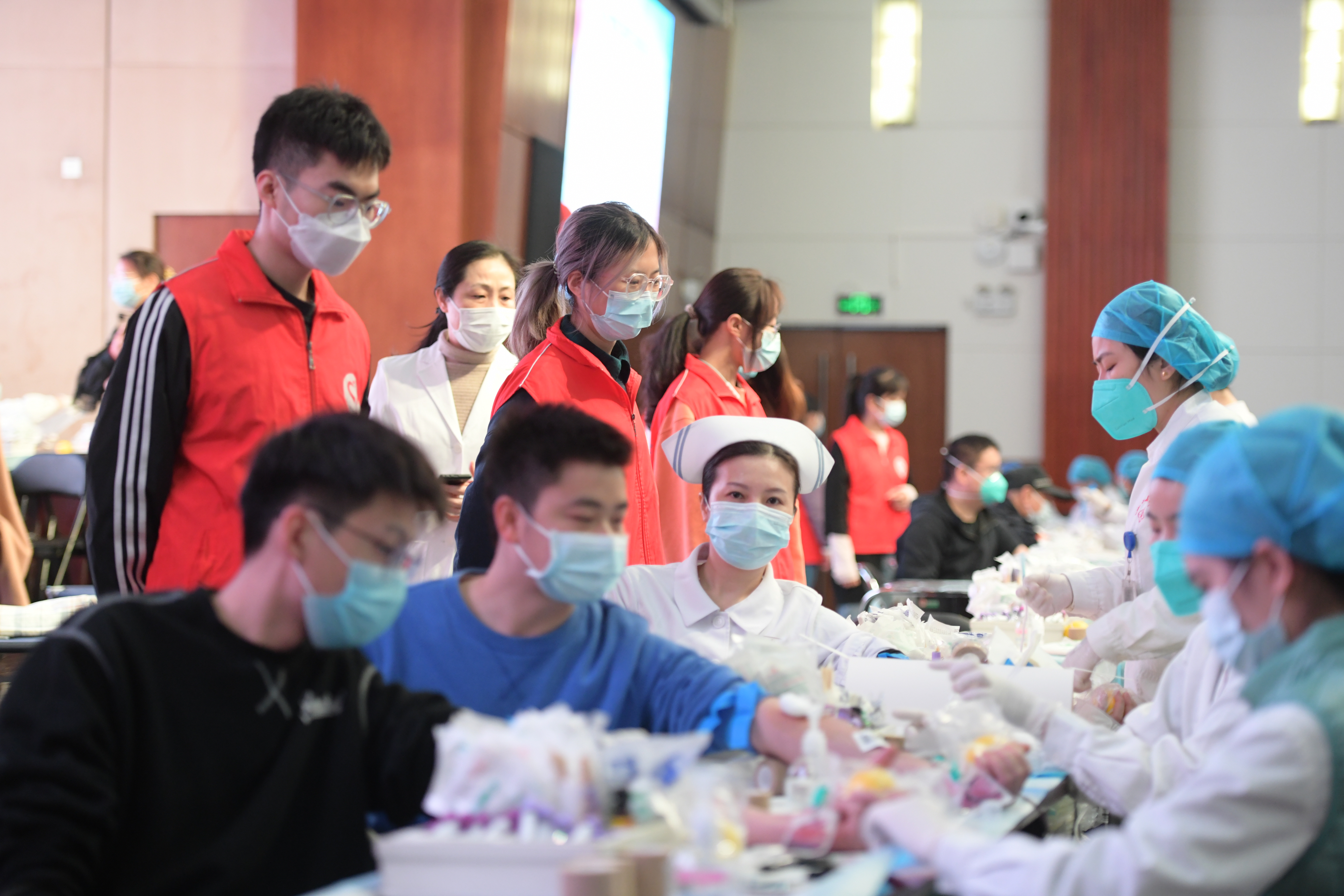 活动现场,参与献血的医务人员在工作人员的指导下有条不紊地进行登记、验血、献血等事项,同时医院工会为医务人员提供葡萄糖、鸡蛋、牛奶等营养补给和服务保障,确保献血活动有序进行。