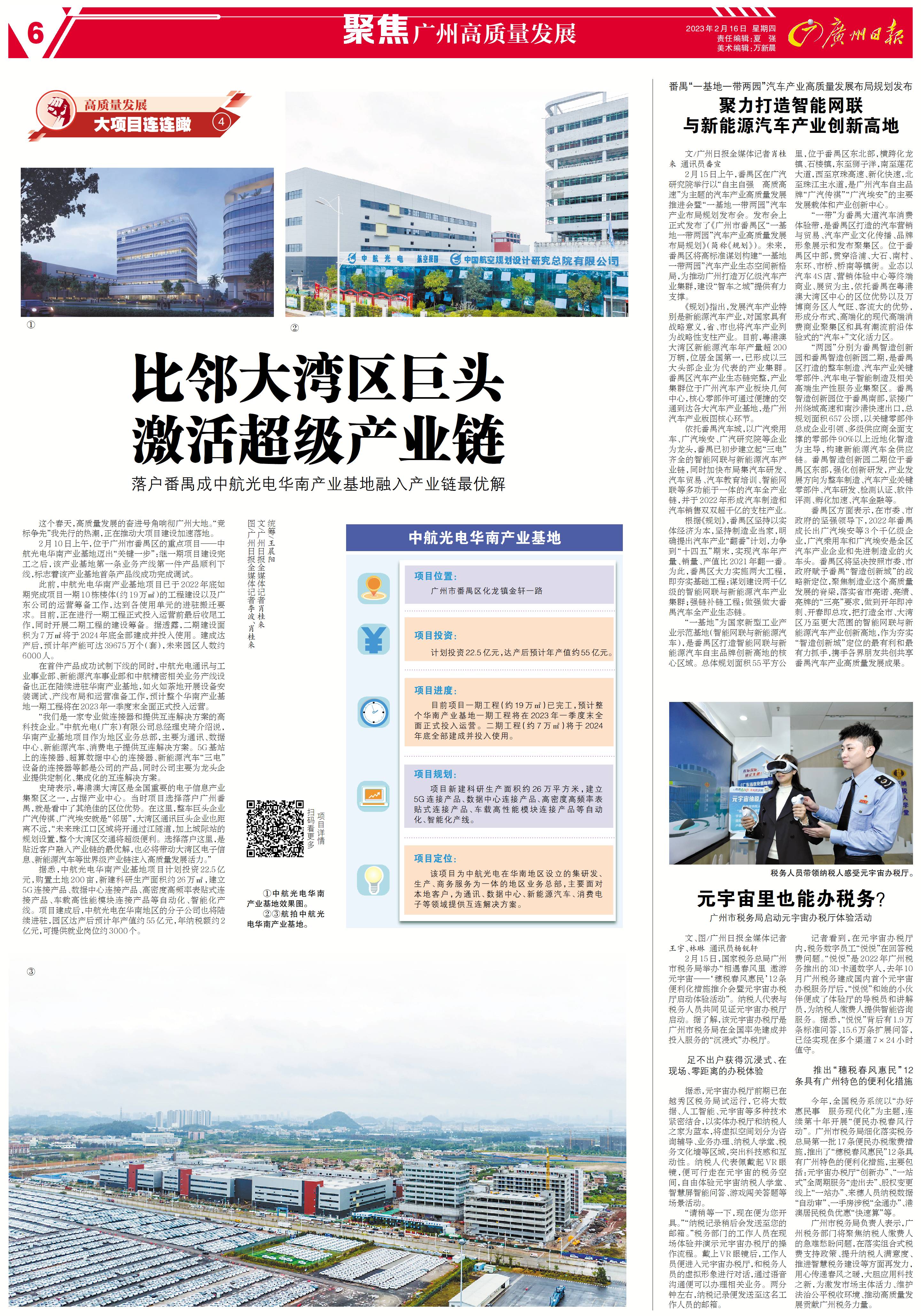 史琦表示,粤港澳大湾区是全国重要的电子信息产业集聚区之一,占据产业中心。当时项目选择落户广州番禺,就是看中了其绝佳的区位优势。在这里,整车巨头企业广汽传祺、广汽埃安就是“邻居”,大湾区通讯巨头企业也距离不远,“未来珠江口区域将开通过江隧道,加上城际站的规划设置,整个大湾区交通将超级便利。选择落户这里,是贴近客户融入产业链的最优解,也必将带动大湾区电子信息、新能源汽车等世界级产业链注入高质量发展活力。”