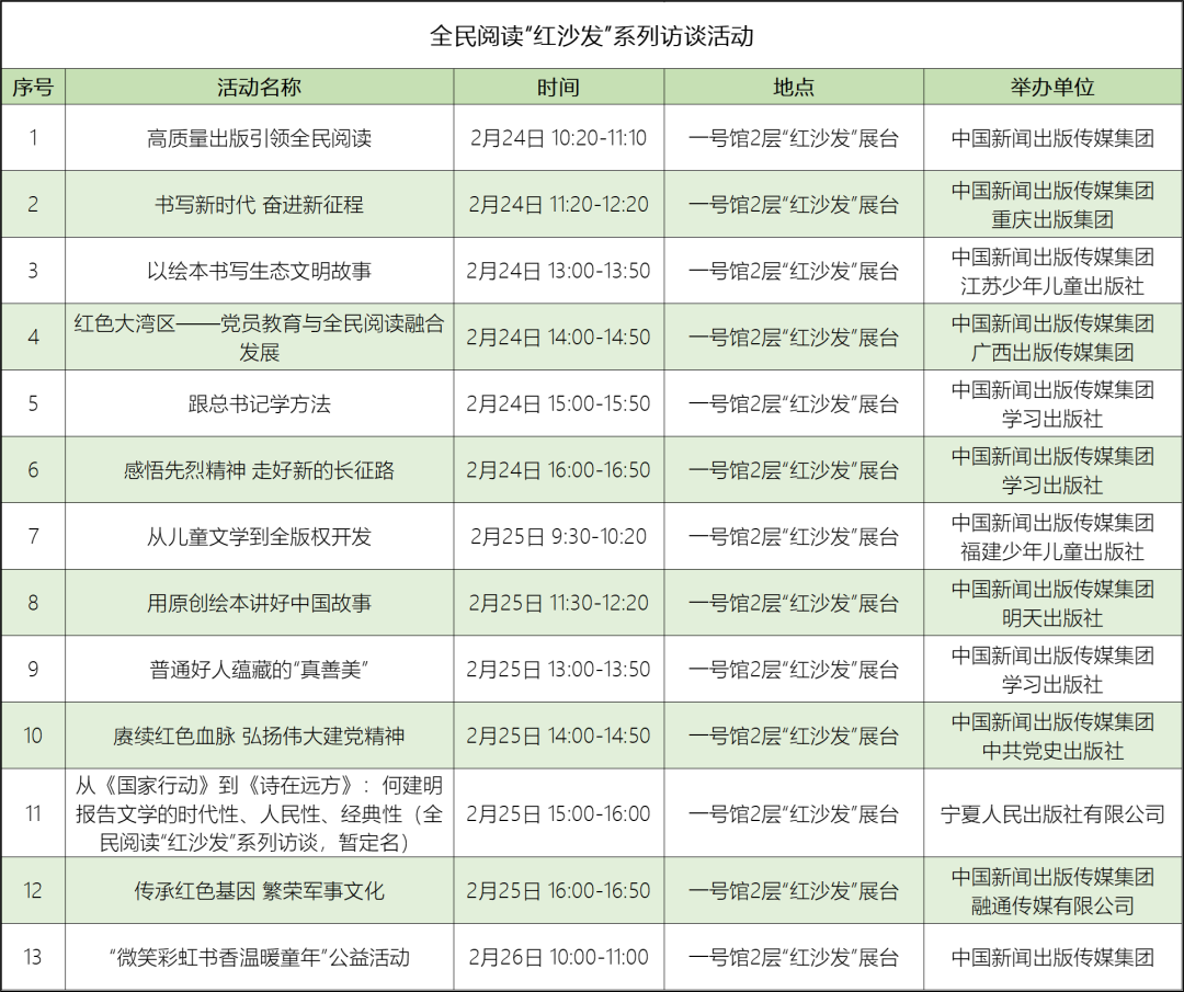 本届订货会将在多个场馆区域内外联动,举办形式多样、内容丰富的主题活动。既有订货会核心内容,如北京图书订货会论坛和中国出版发展报告会等重磅论坛,引导行业创新发展,砥砺前行;也保留多个叫好又叫座的经典节目,如大家读好书、新闻发布厅、“红沙发”系列访谈、全国馆社高层论坛等;还有首次亮相,备受业界期待的新面孔,如首次开通“社长荐书”直播间,邀请各大出版社社长、总编、专家等走进订货会直播间进行荐书。利用出版专业网络平台优势,联合行业及主流媒体,通过社长荐书和图书现场展示,为线上线下的读者带来丰富的文化体验。