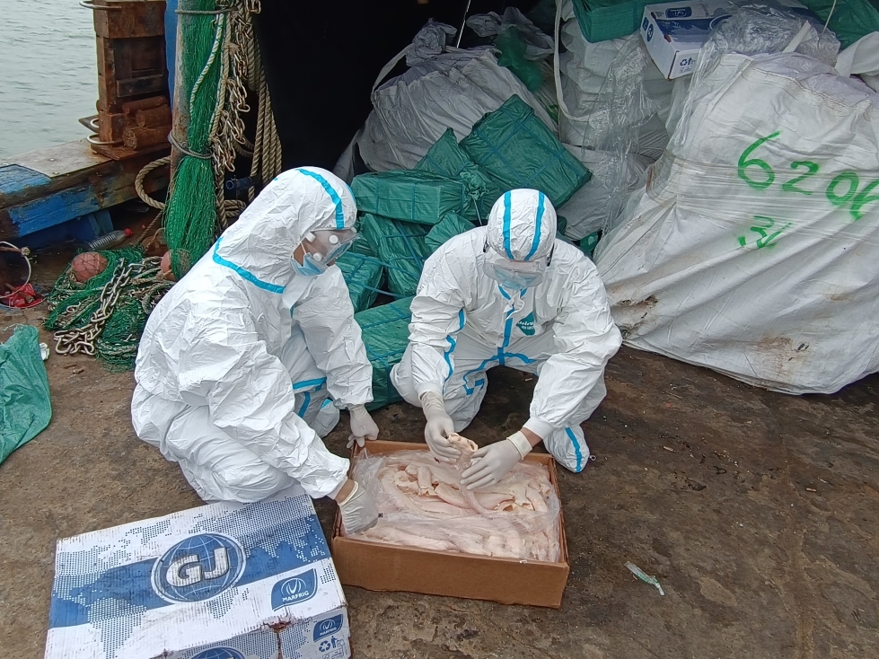 经查,该木质渔船无船名船号,船舱内有大量白色太空袋,袋内纸箱装有来源不明的牛肚、牛百叶等冻品约28吨,船上5名船员均无法提供冻品合法手续来源及相关检验检疫证明,执法员遂依法对该船以及冻品进行扣押。