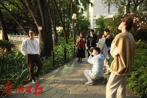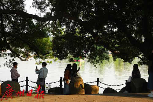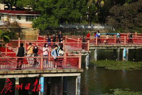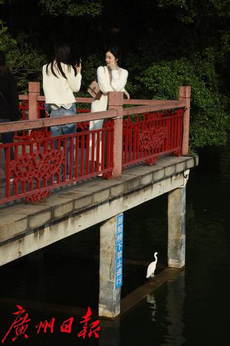 东山湖公园,年轻人在九曲桥上拍照,一只白鹭在桥下闲庭信步。