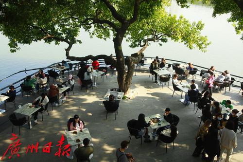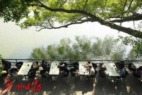 东山湖公园某餐厅,食客边品尝美食边欣赏湖边春色。