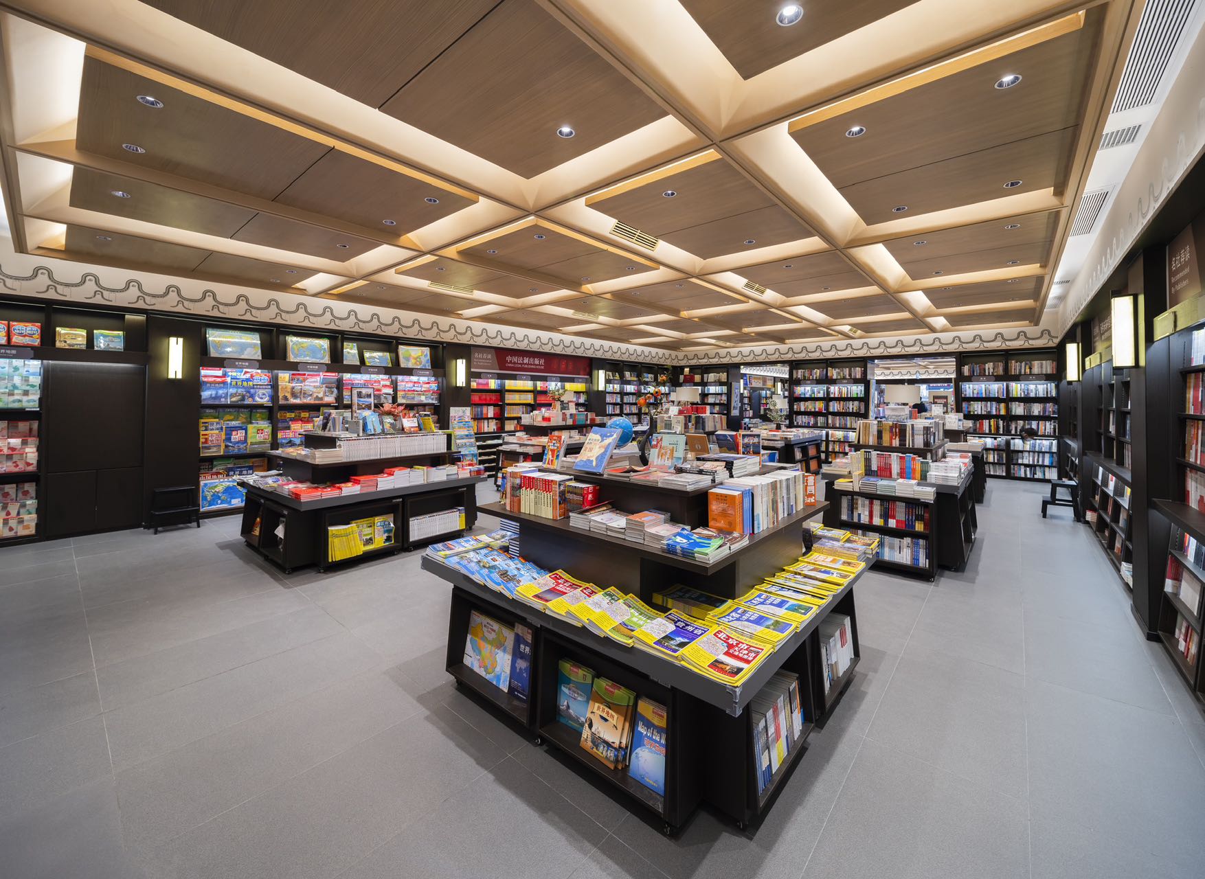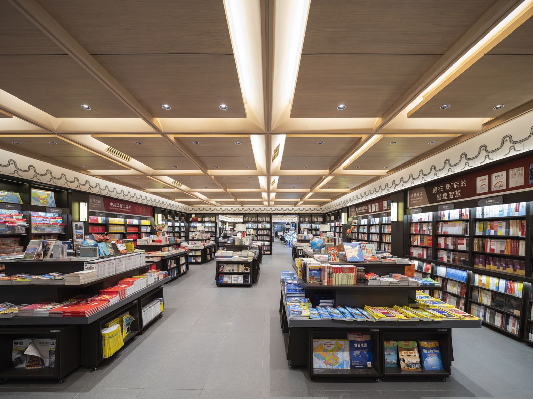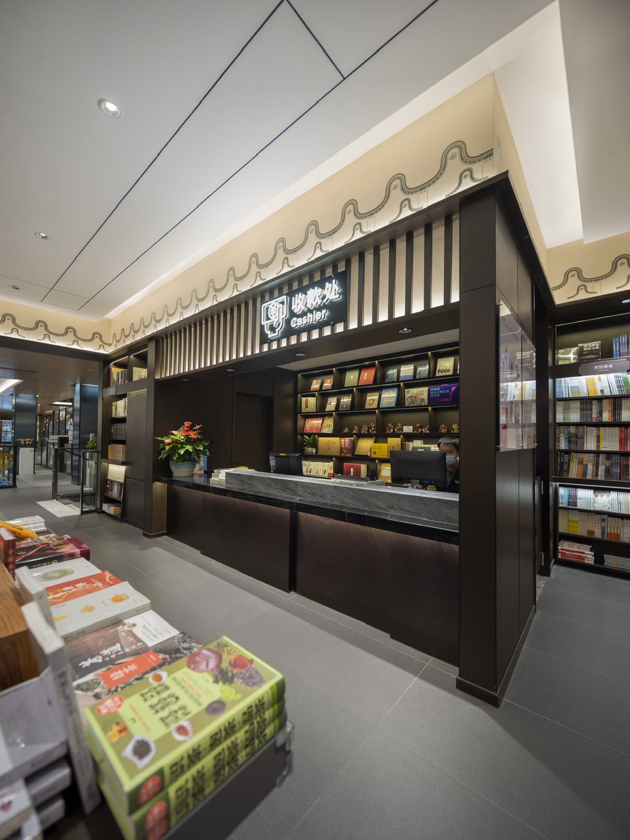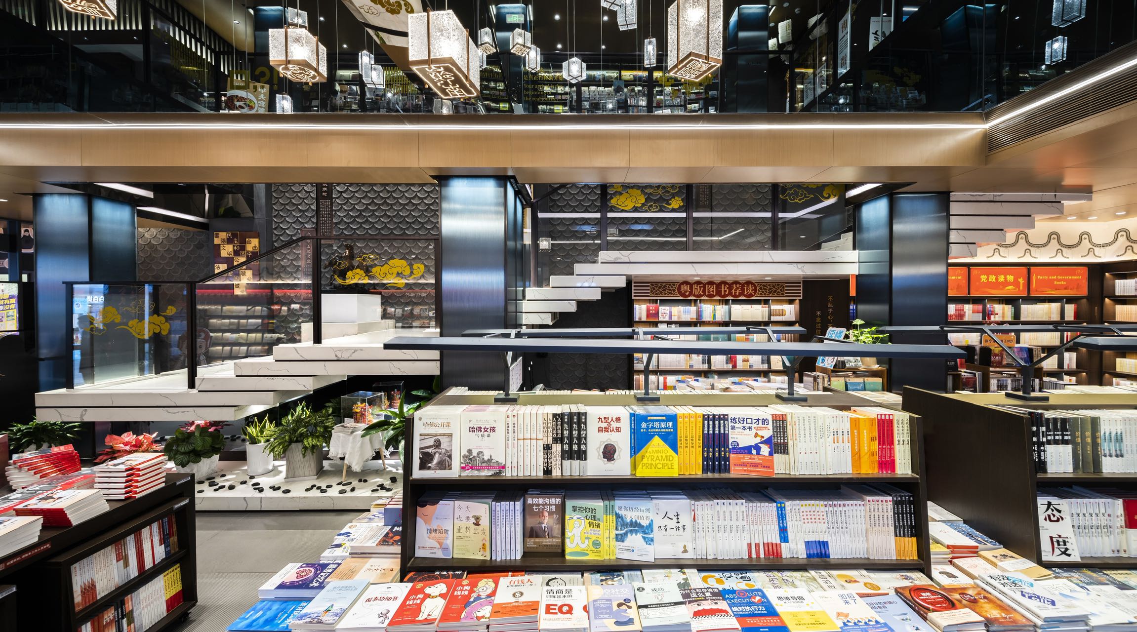 时代的记忆源自瓦当纹理装饰、地标装饰铜雕画,以及店内种种渲染岭南建筑的气象。金云禧则更加希望从整个空间的行为路线设计,来传达岭南文化中闲适和雅致的独特审美——楼梯并非直上直下,而是蜿蜒曲折,有景可停;店中长长的书厅不是一览而尽,而是各处不同,有开有阖,引导读者按场景分布,有的聚拢围坐,有的散立翻阅。