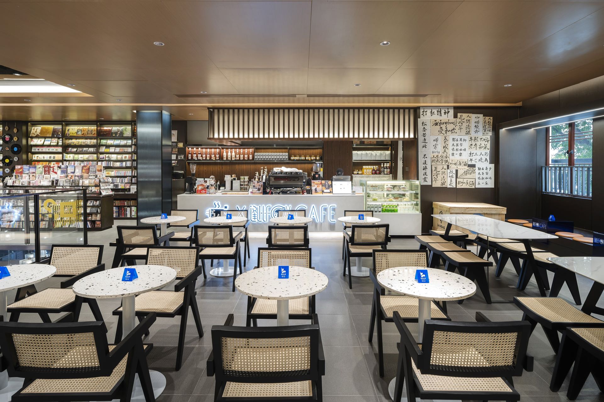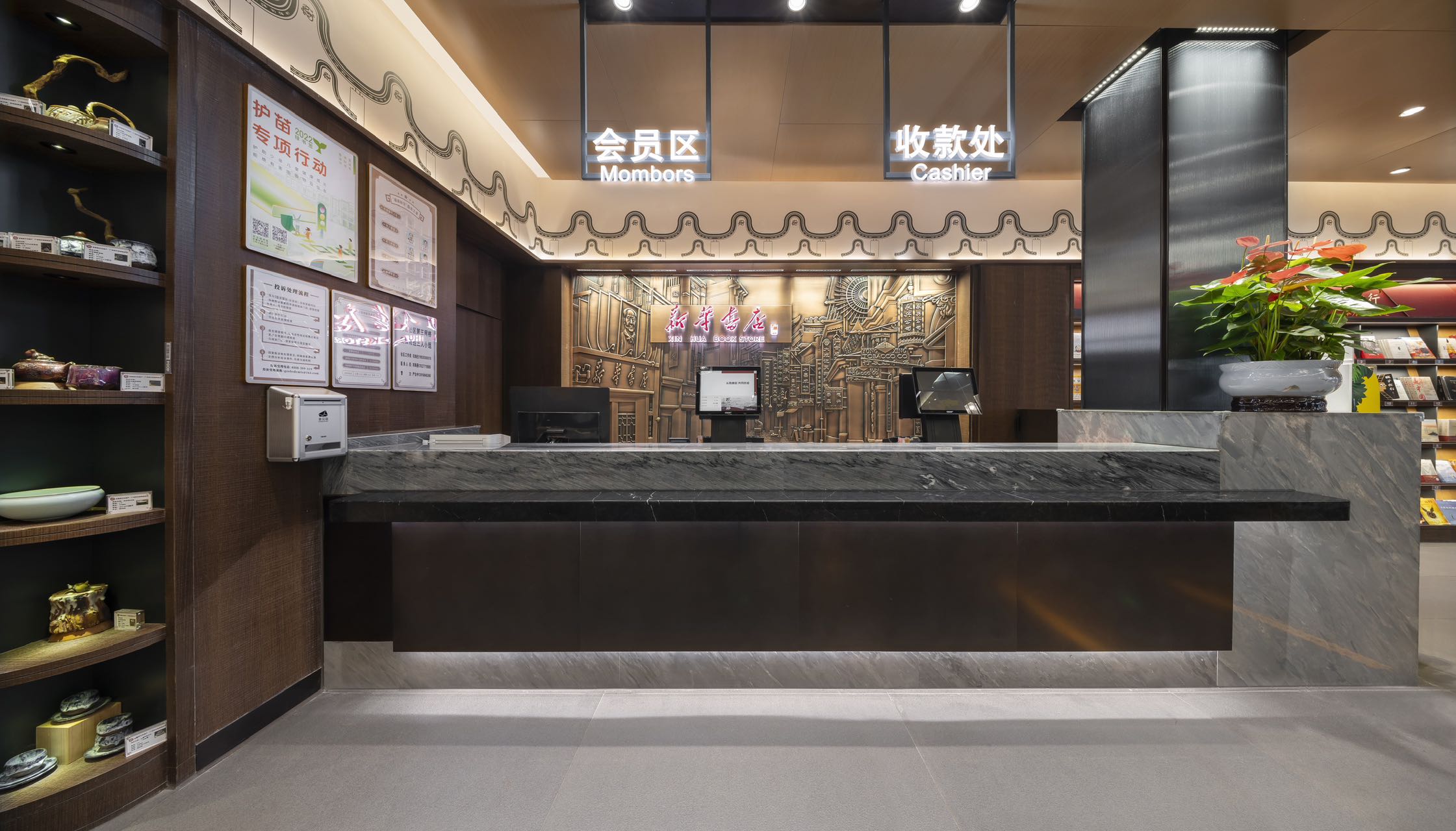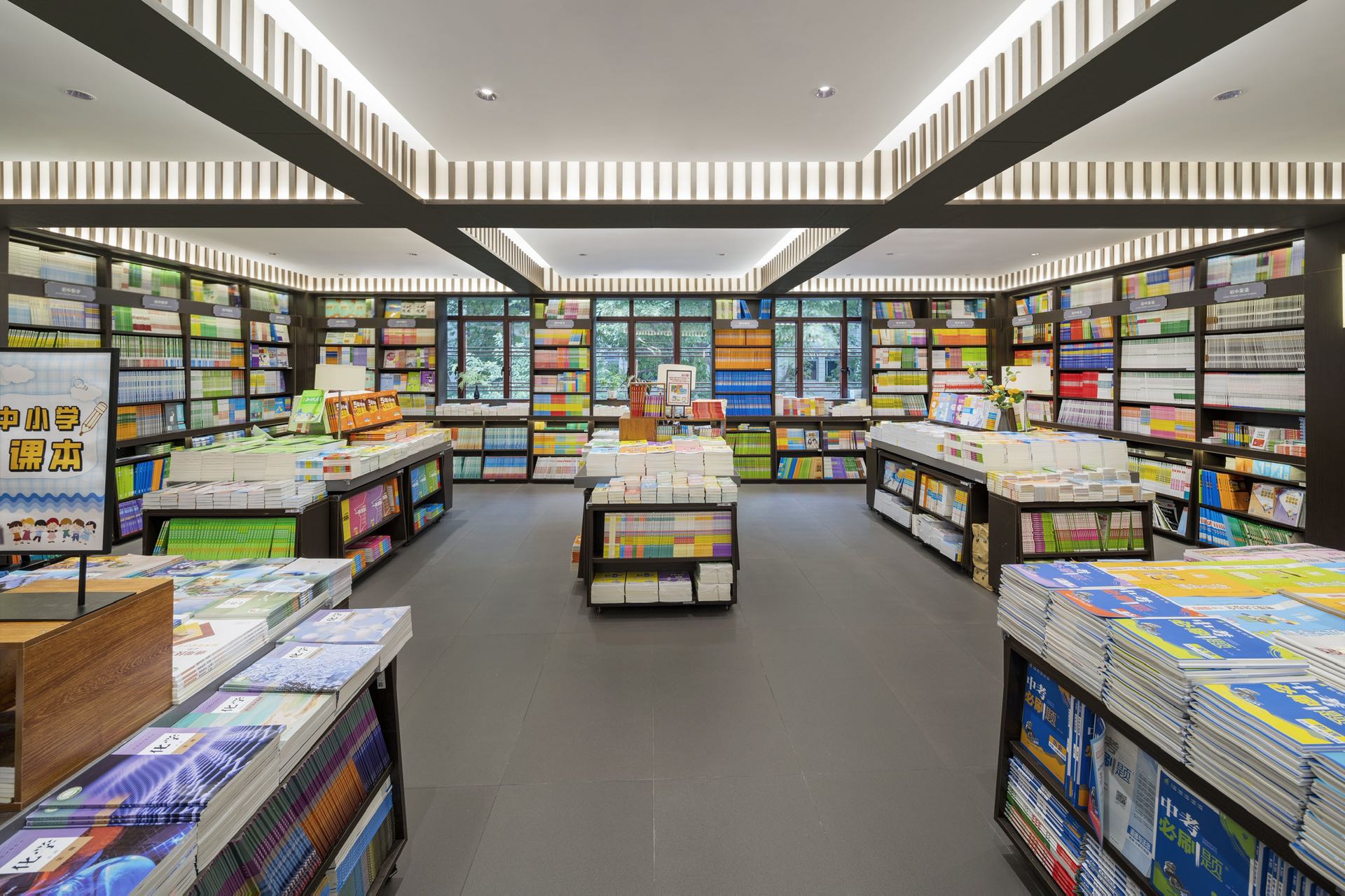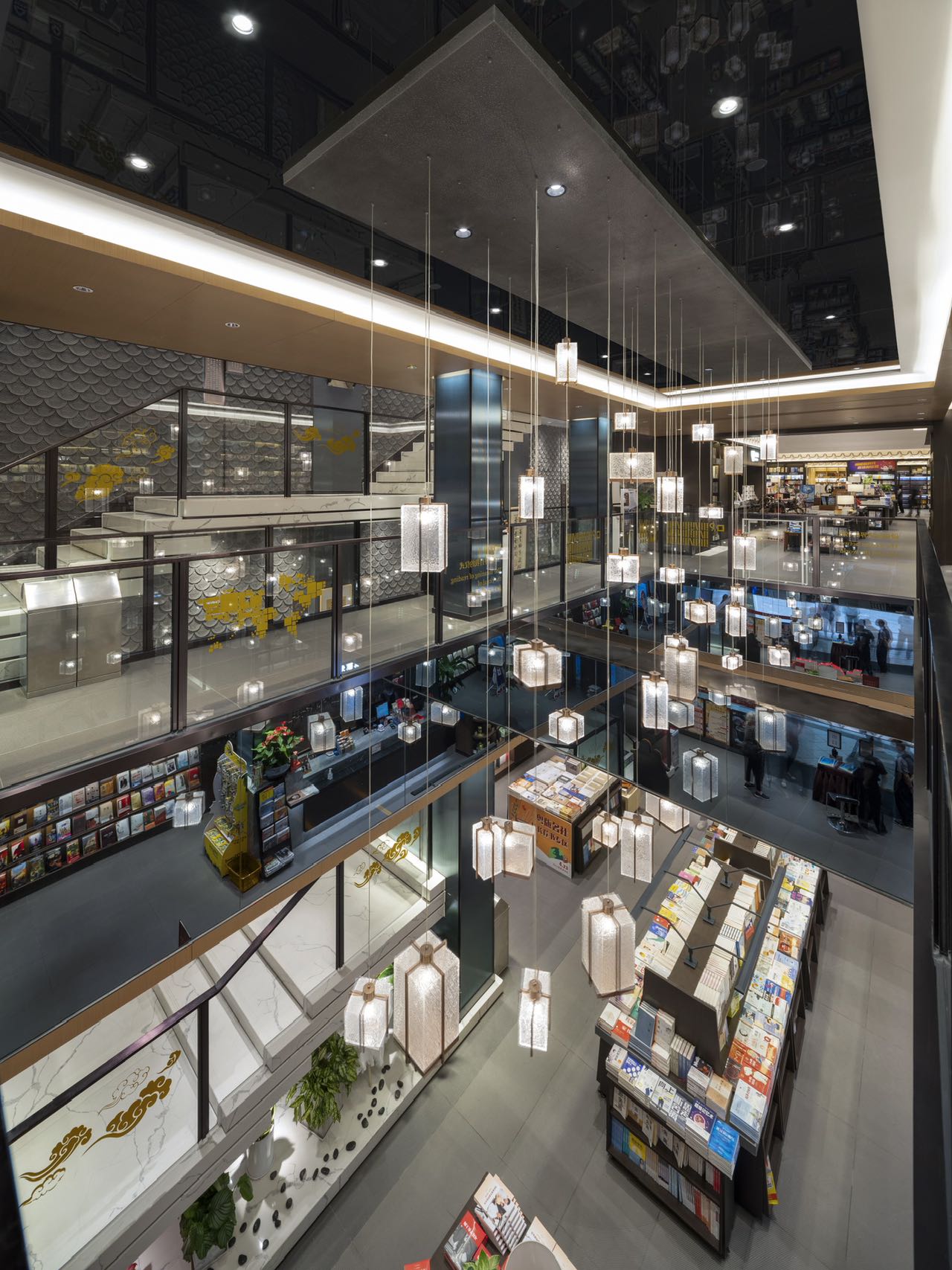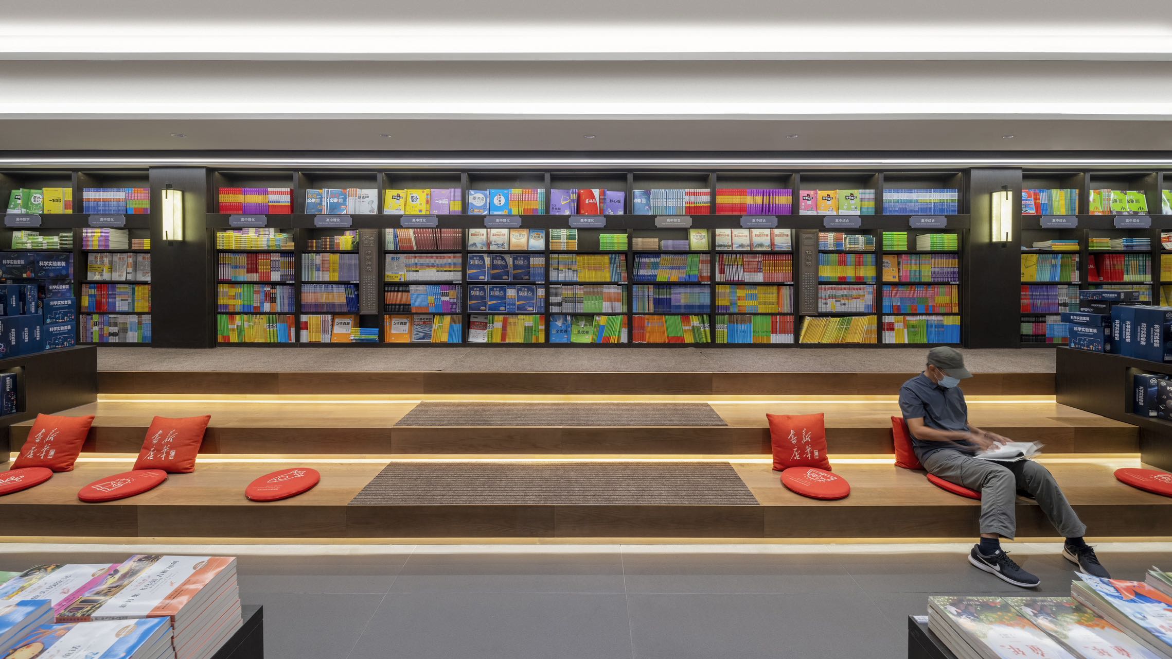 时代的记忆源自瓦当纹理装饰、地标装饰铜雕画,以及店内种种渲染岭南建筑的气象。金云禧则更加希望从整个空间的行为路线设计,来传达岭南文化中闲适和雅致的独特审美——楼梯并非直上直下,而是蜿蜒曲折,有景可停;店中长长的书厅不是一览而尽,而是各处不同,有开有阖,引导读者按场景分布,有的聚拢围坐,有的散立翻阅。