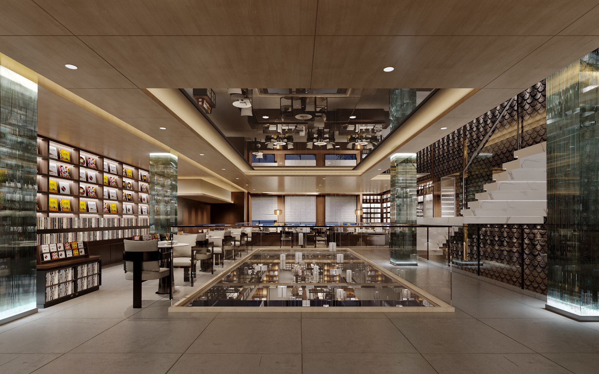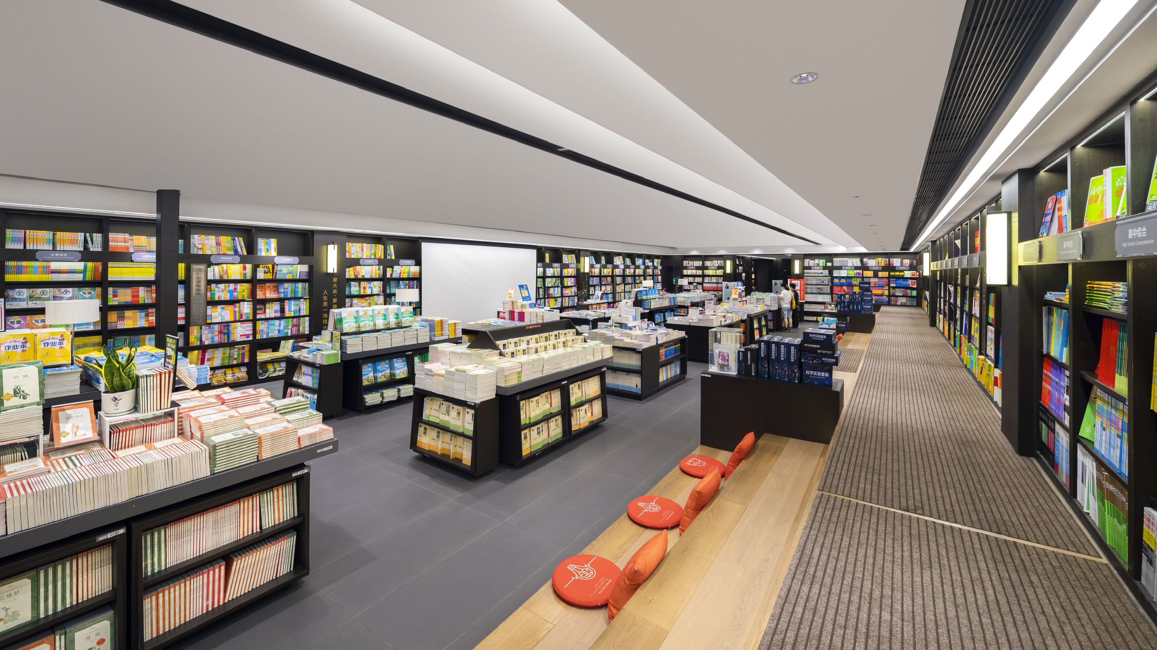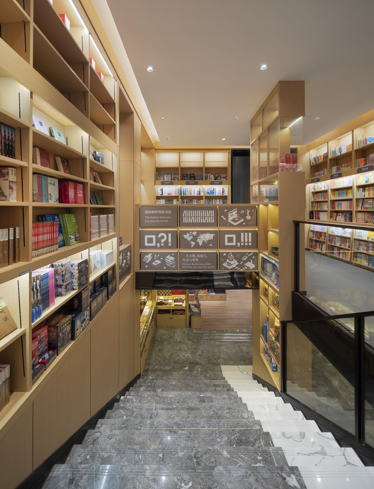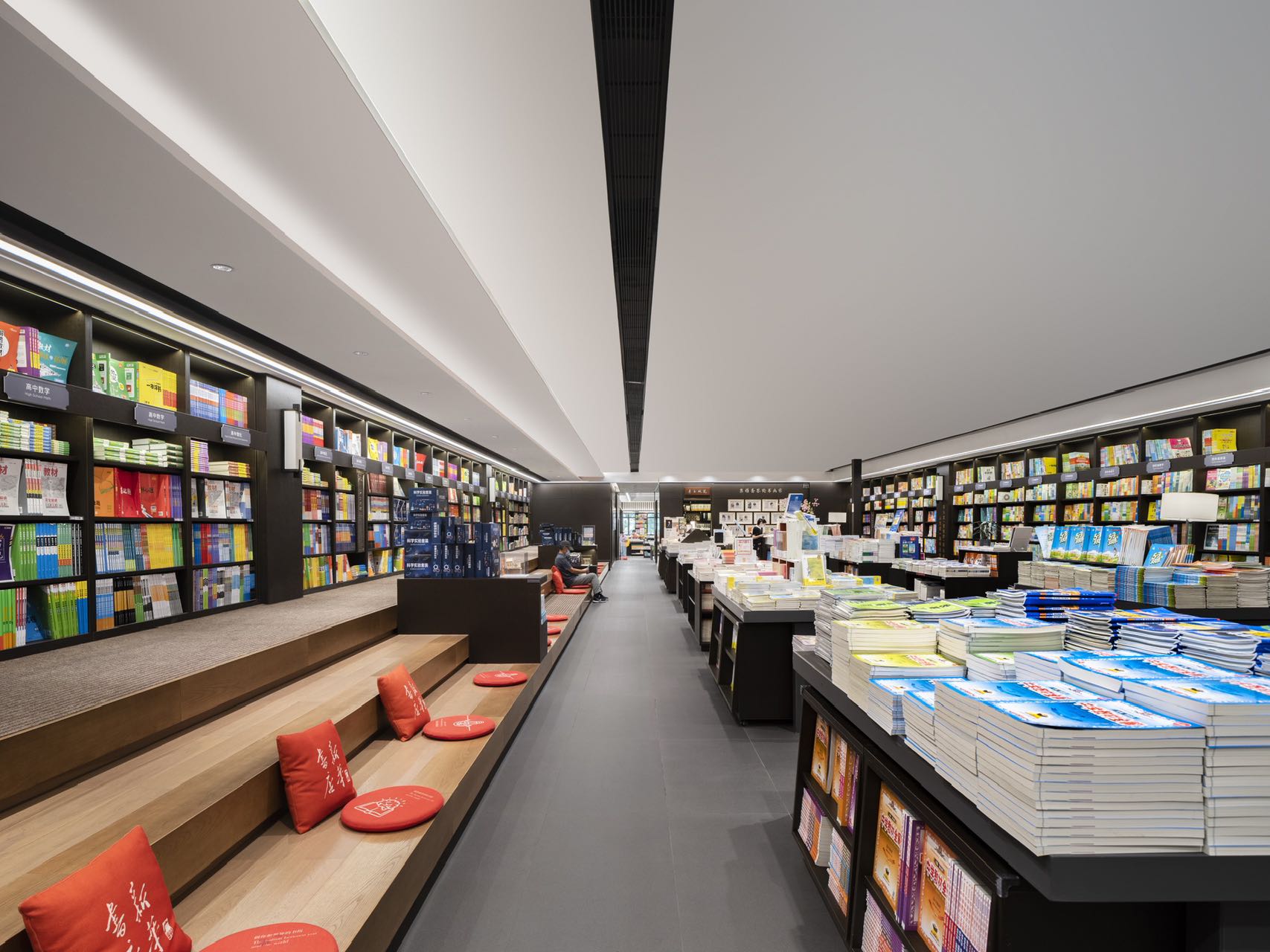 时代的记忆源自瓦当纹理装饰、地标装饰铜雕画,以及店内种种渲染岭南建筑的气象。金云禧则更加希望从整个空间的行为路线设计,来传达岭南文化中闲适和雅致的独特审美——楼梯并非直上直下,而是蜿蜒曲折,有景可停;店中长长的书厅不是一览而尽,而是各处不同,有开有阖,引导读者按场景分布,有的聚拢围坐,有的散立翻阅。