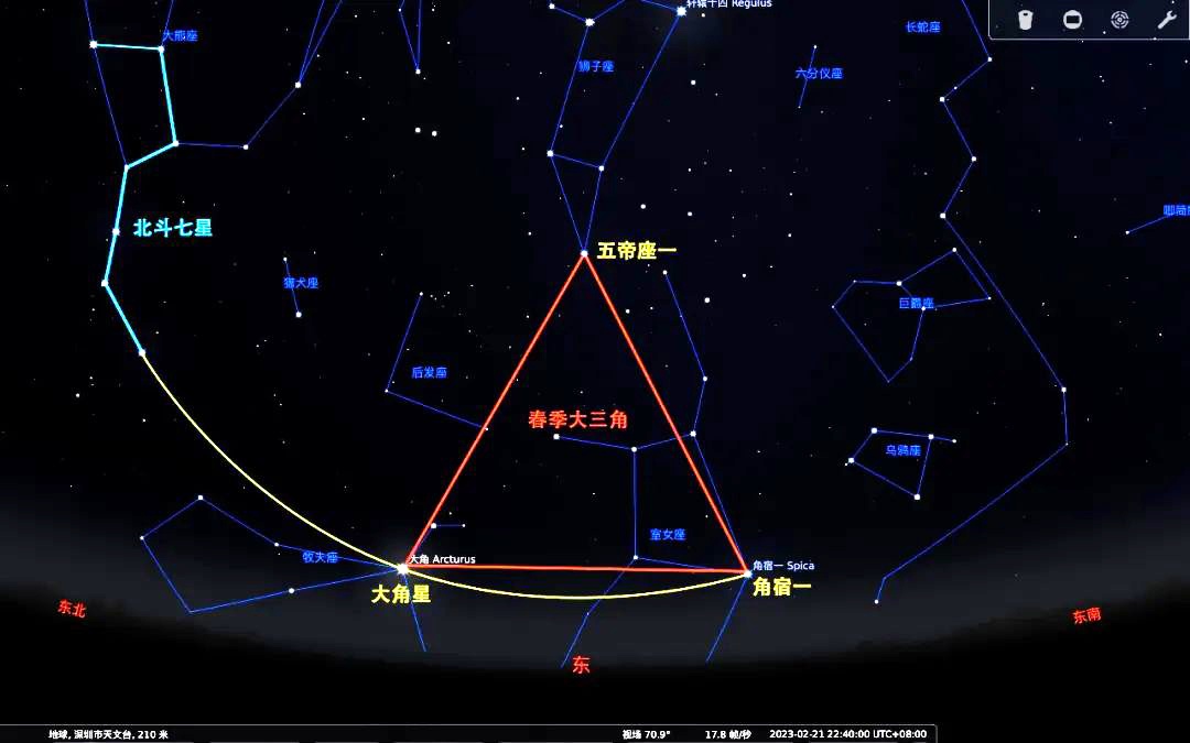 △2月21日傍晚,角宿一、大角相对位置示意图 图源:北京天文馆